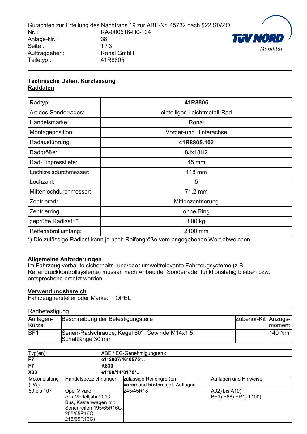 Dieses Gutachten (abe) bezieht sich auf die Alufelge brand-ronal 41R8805 in der Ausführung 8Jx18 ET 0, Mittenloch 0 mm (KBA 45732). Im PDF findest du typischerweise zulässige Reifengrößen, Auflagen/Anbauhinweise und – je nach Dokument – Hinweise zur Eintragung.