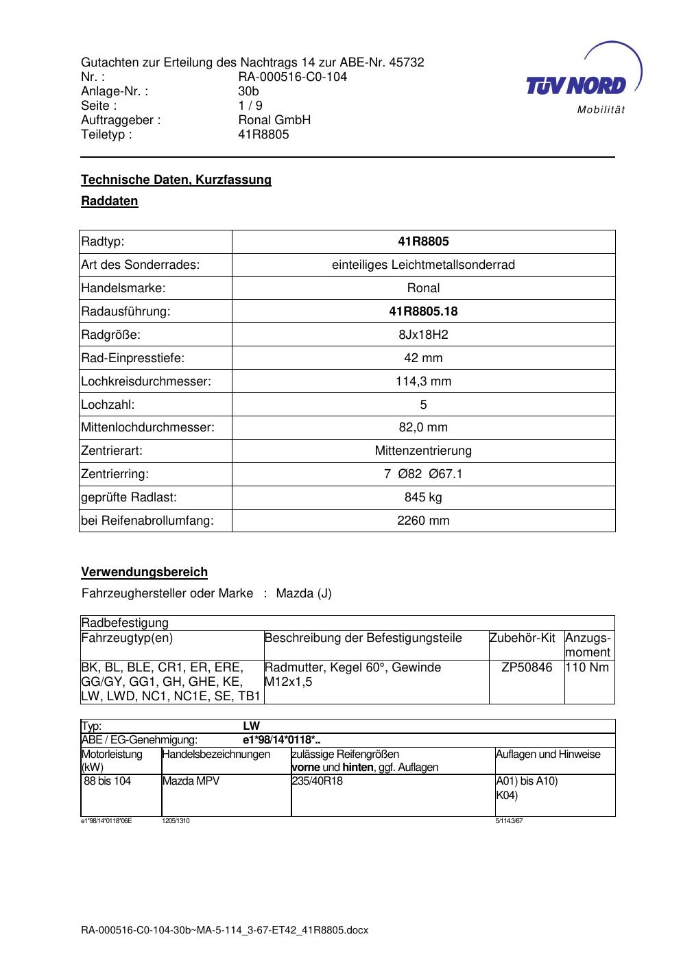Dieses Gutachten (abe) bezieht sich auf die Alufelge brand-ronal 41R8805 in der Ausführung 8Jx18 ET 0, Mittenloch 0 mm (KBA 45732). Im PDF findest du typischerweise zulässige Reifengrößen, Auflagen/Anbauhinweise und – je nach Dokument – Hinweise zur Eintragung.