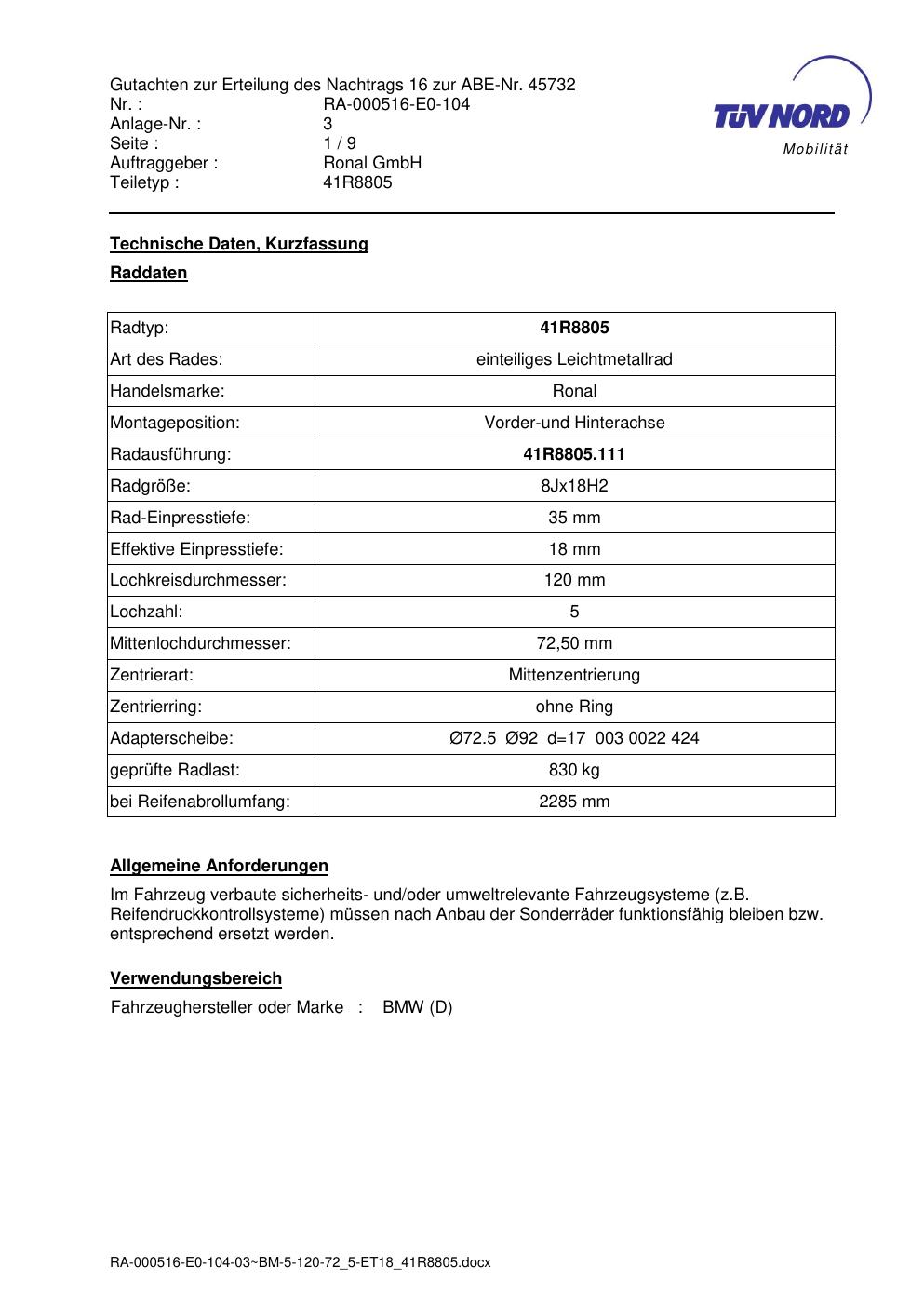 Dieses Gutachten (abe) bezieht sich auf die Alufelge brand-ronal 41R8805 in der Ausführung 8Jx18 ET 0, Mittenloch 0 mm (KBA 45732). Im PDF findest du typischerweise zulässige Reifengrößen, Auflagen/Anbauhinweise und – je nach Dokument – Hinweise zur Eintragung.
