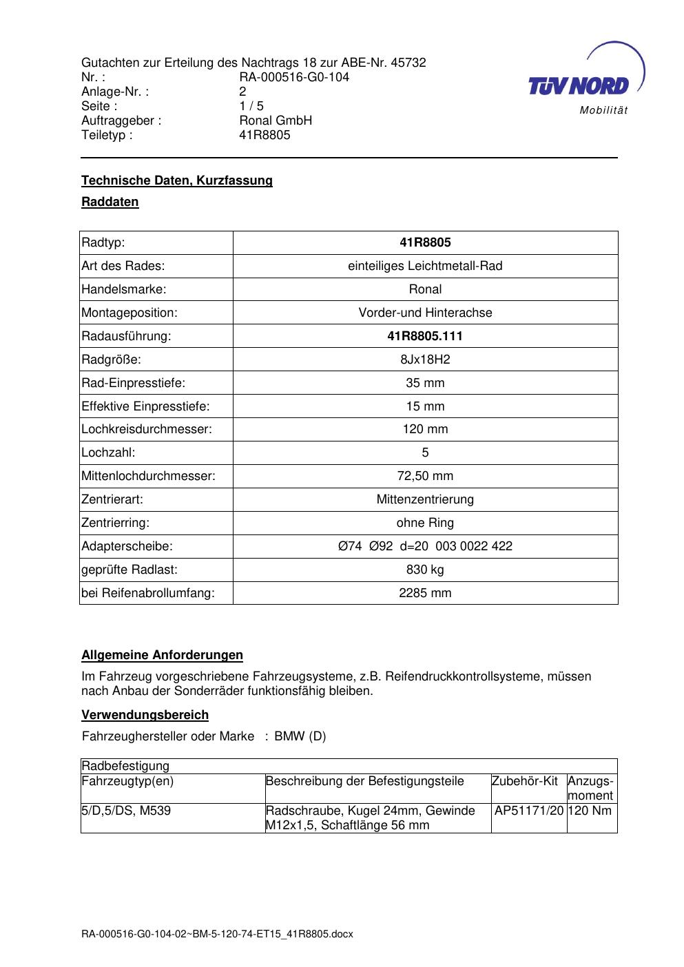 Dieses Gutachten (abe) bezieht sich auf die Alufelge brand-ronal 41R8805 in der Ausführung 8Jx18 ET 0, Mittenloch 0 mm (KBA 45732). Im PDF findest du typischerweise zulässige Reifengrößen, Auflagen/Anbauhinweise und – je nach Dokument – Hinweise zur Eintragung.