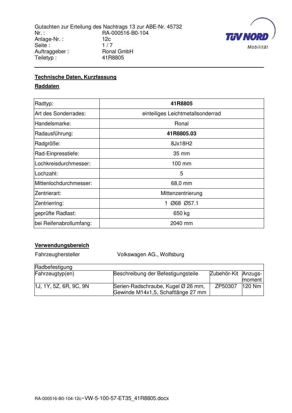 Dieses Gutachten (abe) bezieht sich auf die Alufelge brand-ronal 41R8805 in der Ausführung 8Jx18 ET 0, Mittenloch 0 mm (KBA 45732). Im PDF findest du typischerweise zulässige Reifengrößen, Auflagen/Anbauhinweise und – je nach Dokument – Hinweise zur Eintragung.