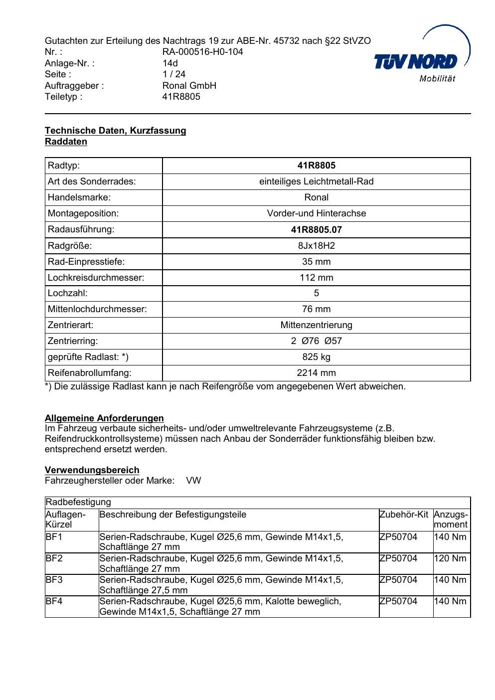Dieses Gutachten (abe) bezieht sich auf die Alufelge brand-ronal 41R8805 in der Ausführung 8Jx18 ET 0, Mittenloch 0 mm (KBA 45732). Im PDF findest du typischerweise zulässige Reifengrößen, Auflagen/Anbauhinweise und – je nach Dokument – Hinweise zur Eintragung.