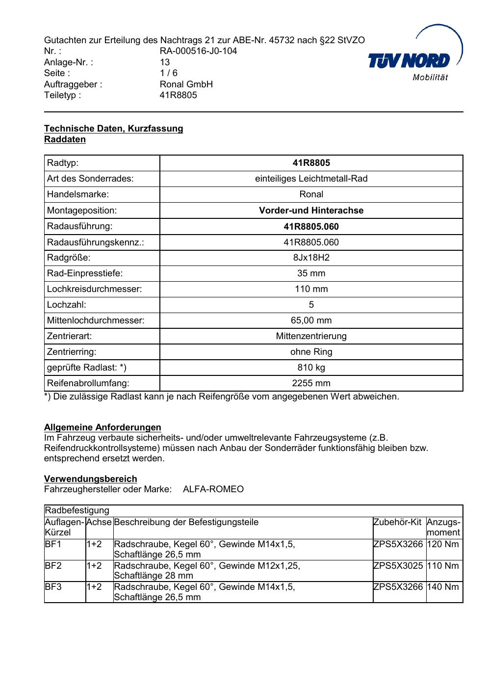 Dieses Gutachten (abe) bezieht sich auf die Alufelge brand-ronal 41R8805 in der Ausführung 8Jx18 ET 0, Mittenloch 0 mm (KBA 45732). Im PDF findest du typischerweise zulässige Reifengrößen, Auflagen/Anbauhinweise und – je nach Dokument – Hinweise zur Eintragung.