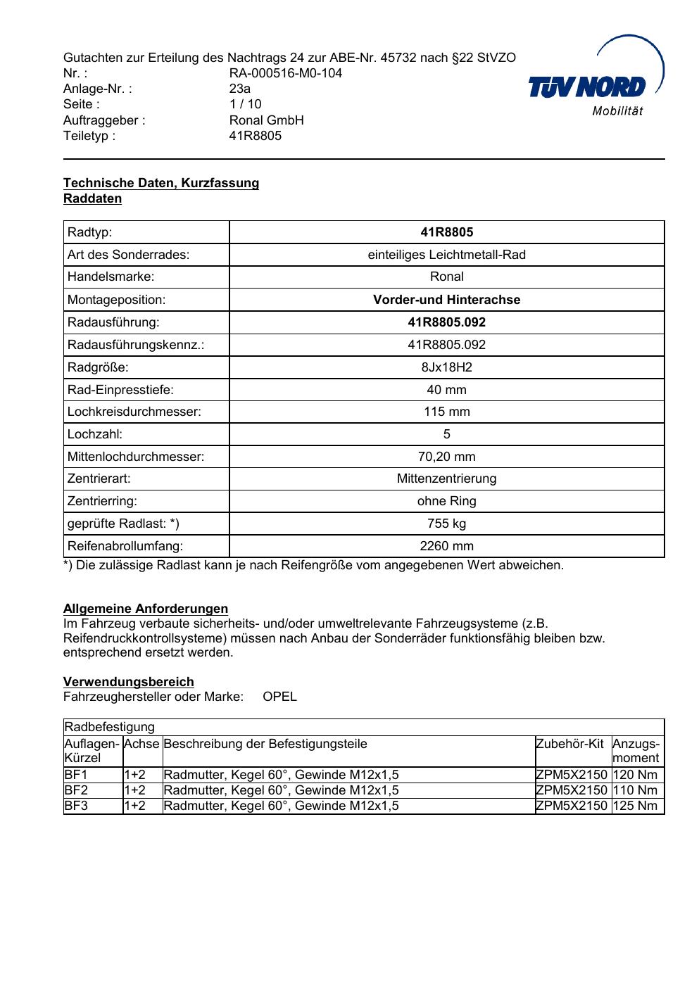 Dieses Gutachten (abe) bezieht sich auf die Alufelge brand-ronal 41R8805 in der Ausführung 8Jx18 ET 0, Mittenloch 0 mm (KBA 45732). Im PDF findest du typischerweise zulässige Reifengrößen, Auflagen/Anbauhinweise und – je nach Dokument – Hinweise zur Eintragung.