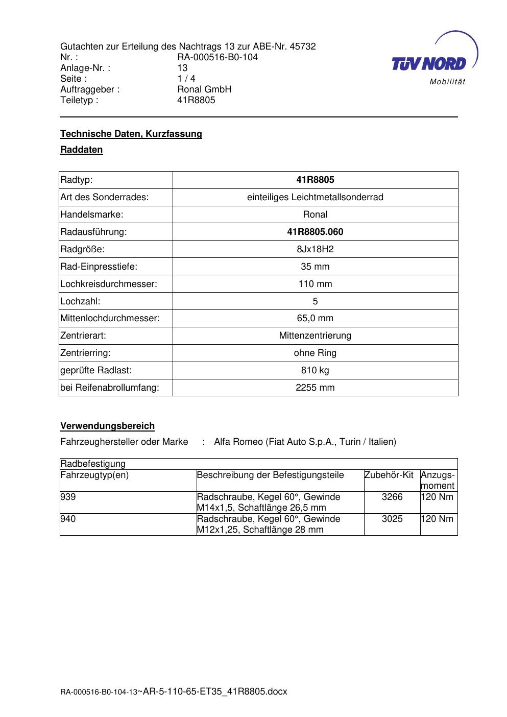 Dieses Gutachten (abe) bezieht sich auf die Alufelge brand-ronal 41R8805 in der Ausführung 8Jx18 ET 0, Mittenloch 0 mm (KBA 45732). Im PDF findest du typischerweise zulässige Reifengrößen, Auflagen/Anbauhinweise und – je nach Dokument – Hinweise zur Eintragung.