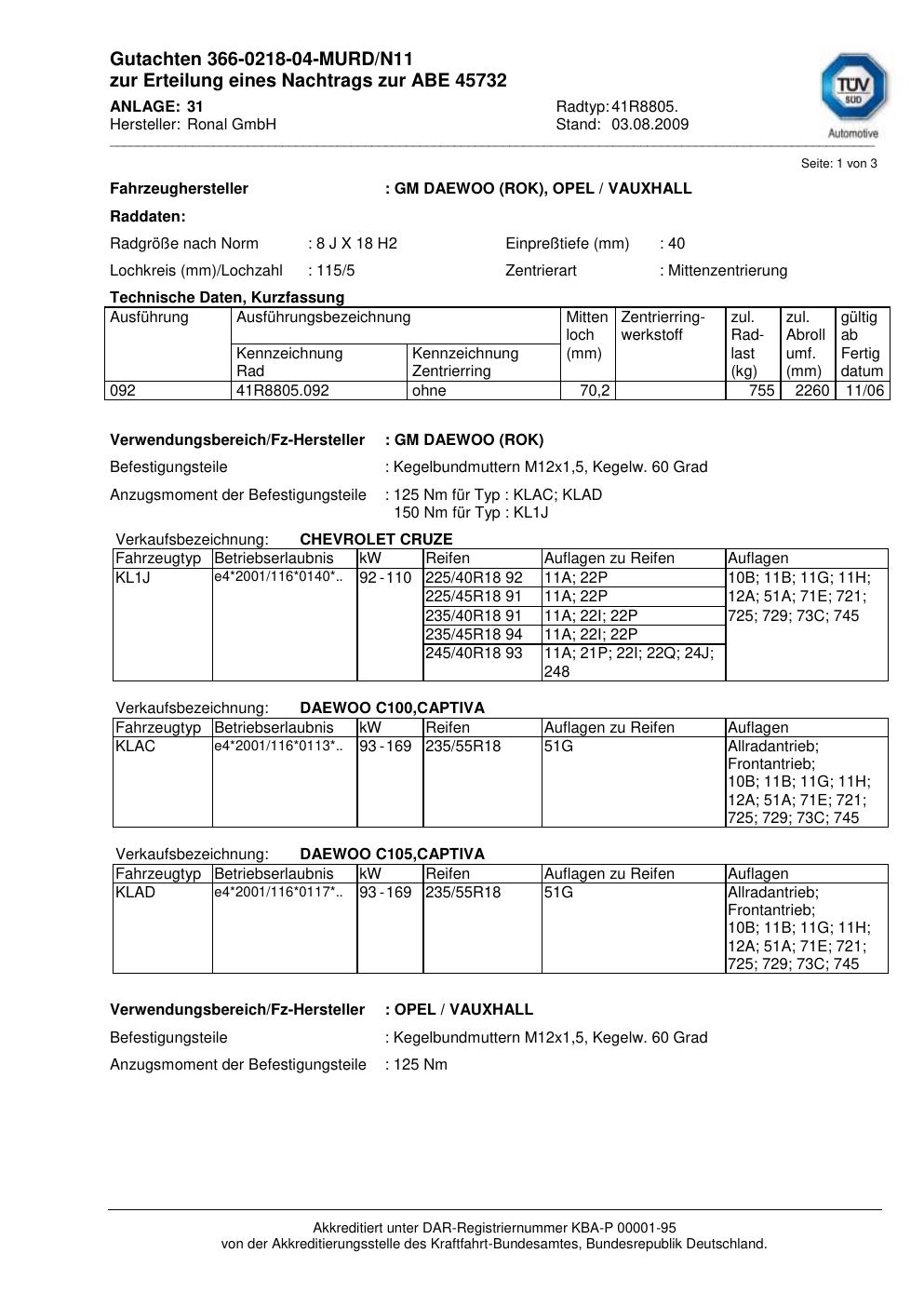 Dieses Gutachten (abe) bezieht sich auf die Alufelge brand-ronal 41R8805 in der Ausführung 8Jx18 ET 0, Mittenloch 0 mm (KBA 45732). Im PDF findest du typischerweise zulässige Reifengrößen, Auflagen/Anbauhinweise und – je nach Dokument – Hinweise zur Eintragung.
