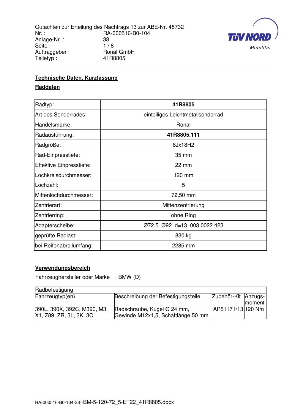 Dieses Gutachten (abe) bezieht sich auf die Alufelge brand-ronal 41R8805 in der Ausführung 8Jx18 ET 0, Mittenloch 0 mm (KBA 45732). Im PDF findest du typischerweise zulässige Reifengrößen, Auflagen/Anbauhinweise und – je nach Dokument – Hinweise zur Eintragung.