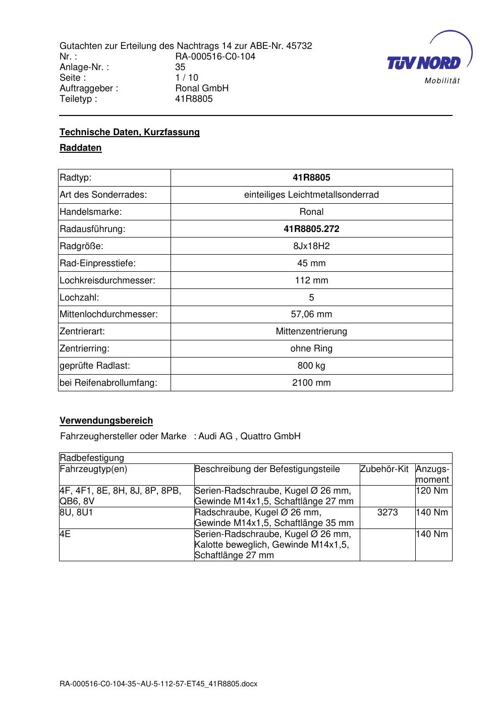 Dieses Gutachten (abe) bezieht sich auf die Alufelge brand-ronal 41R8805 in der Ausführung 8Jx18 ET 0, Mittenloch 0 mm (KBA 45732). Im PDF findest du typischerweise zulässige Reifengrößen, Auflagen/Anbauhinweise und – je nach Dokument – Hinweise zur Eintragung.