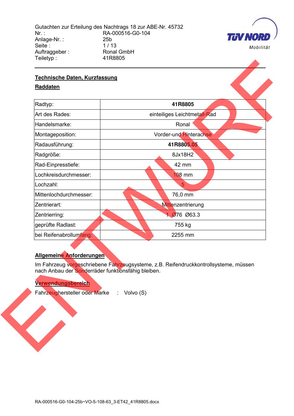 Dieses Gutachten (abe) bezieht sich auf die Alufelge brand-ronal 41R8805 in der Ausführung 8Jx18 ET 0, Mittenloch 0 mm (KBA 45732). Im PDF findest du typischerweise zulässige Reifengrößen, Auflagen/Anbauhinweise und – je nach Dokument – Hinweise zur Eintragung.