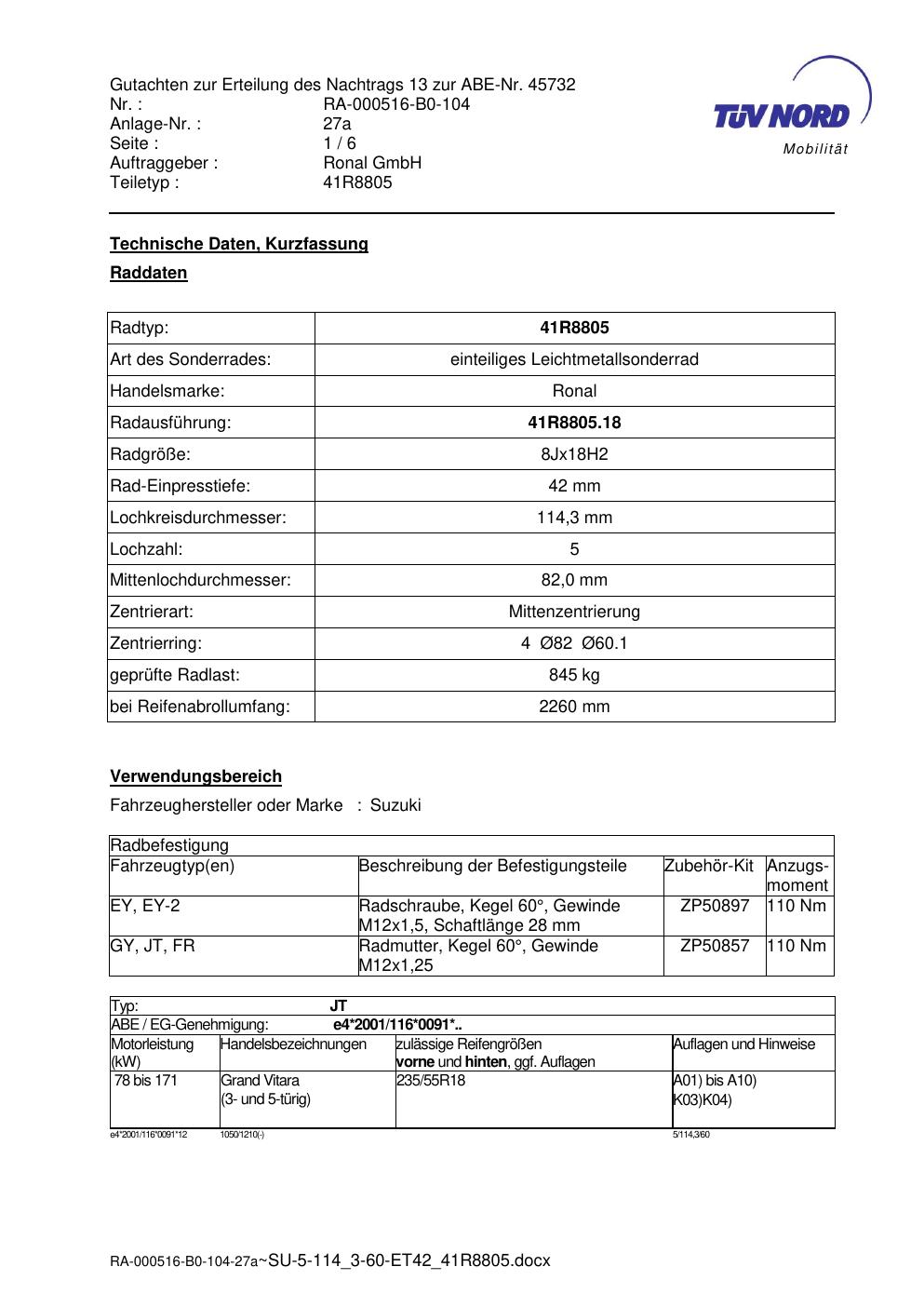 Dieses Gutachten (abe) bezieht sich auf die Alufelge brand-ronal 41R8805 in der Ausführung 8Jx18 ET 0, Mittenloch 0 mm (KBA 45732). Im PDF findest du typischerweise zulässige Reifengrößen, Auflagen/Anbauhinweise und – je nach Dokument – Hinweise zur Eintragung.