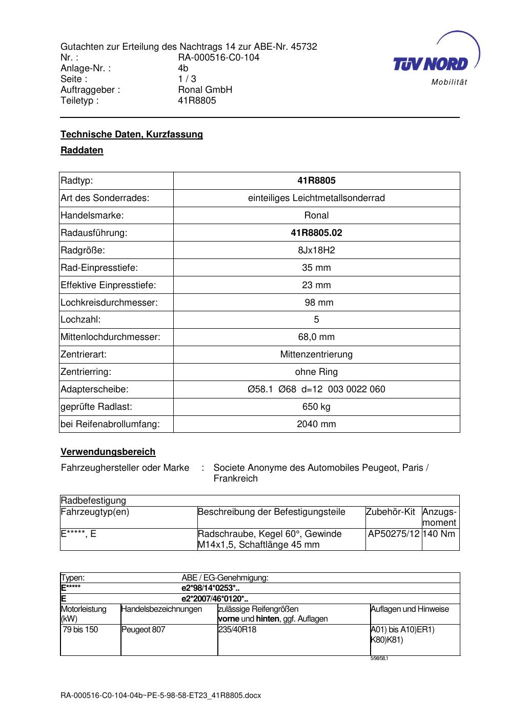 Dieses Gutachten (abe) bezieht sich auf die Alufelge brand-ronal 41R8805 in der Ausführung 8Jx18 ET 0, Mittenloch 0 mm (KBA 45732). Im PDF findest du typischerweise zulässige Reifengrößen, Auflagen/Anbauhinweise und – je nach Dokument – Hinweise zur Eintragung.