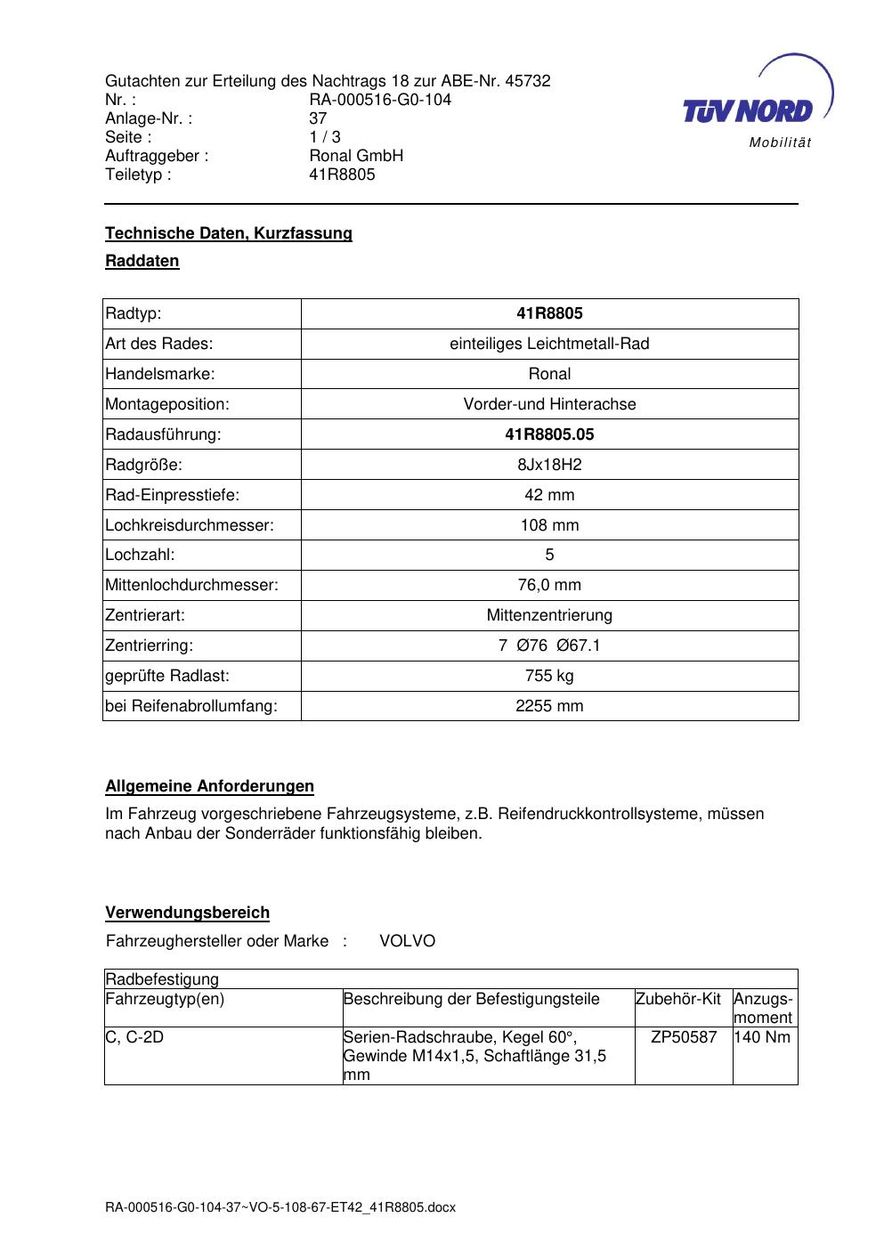 Dieses Gutachten (abe) bezieht sich auf die Alufelge brand-ronal 41R8805 in der Ausführung 8Jx18 ET 0, Mittenloch 0 mm (KBA 45732). Im PDF findest du typischerweise zulässige Reifengrößen, Auflagen/Anbauhinweise und – je nach Dokument – Hinweise zur Eintragung.