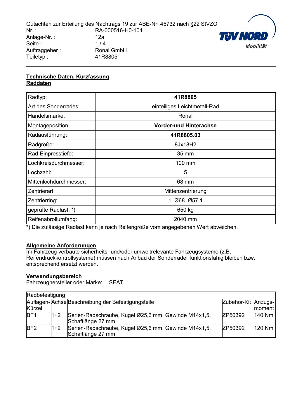 Dieses Gutachten (abe) bezieht sich auf die Alufelge brand-ronal 41R8805 in der Ausführung 8Jx18 ET 0, Mittenloch 0 mm (KBA 45732). Im PDF findest du typischerweise zulässige Reifengrößen, Auflagen/Anbauhinweise und – je nach Dokument – Hinweise zur Eintragung.