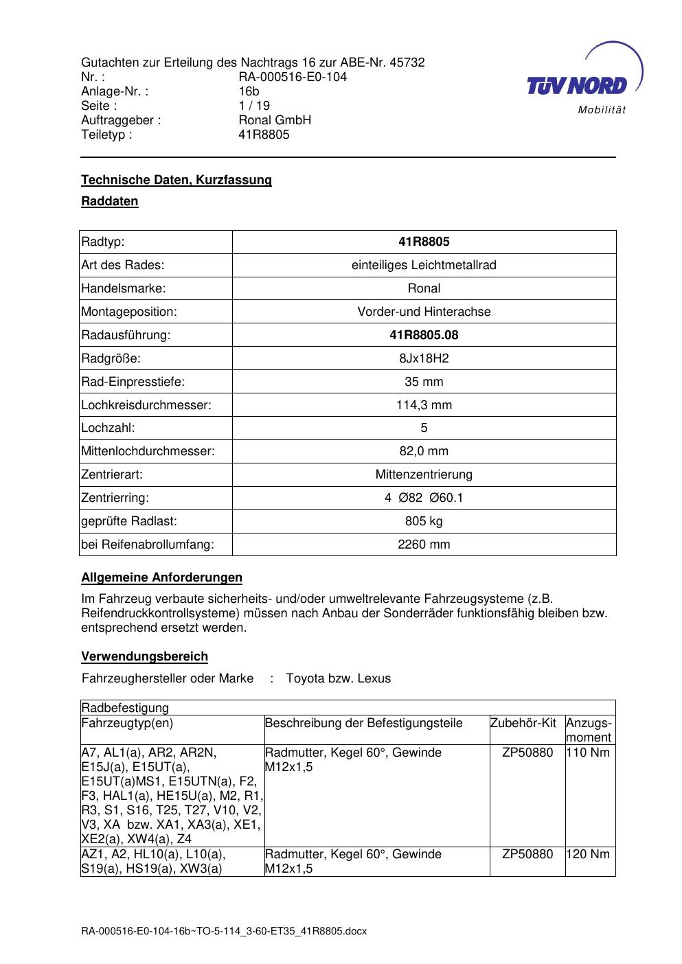 Dieses Gutachten (abe) bezieht sich auf die Alufelge brand-ronal 41R8805 in der Ausführung 8Jx18 ET 0, Mittenloch 0 mm (KBA 45732). Im PDF findest du typischerweise zulässige Reifengrößen, Auflagen/Anbauhinweise und – je nach Dokument – Hinweise zur Eintragung.