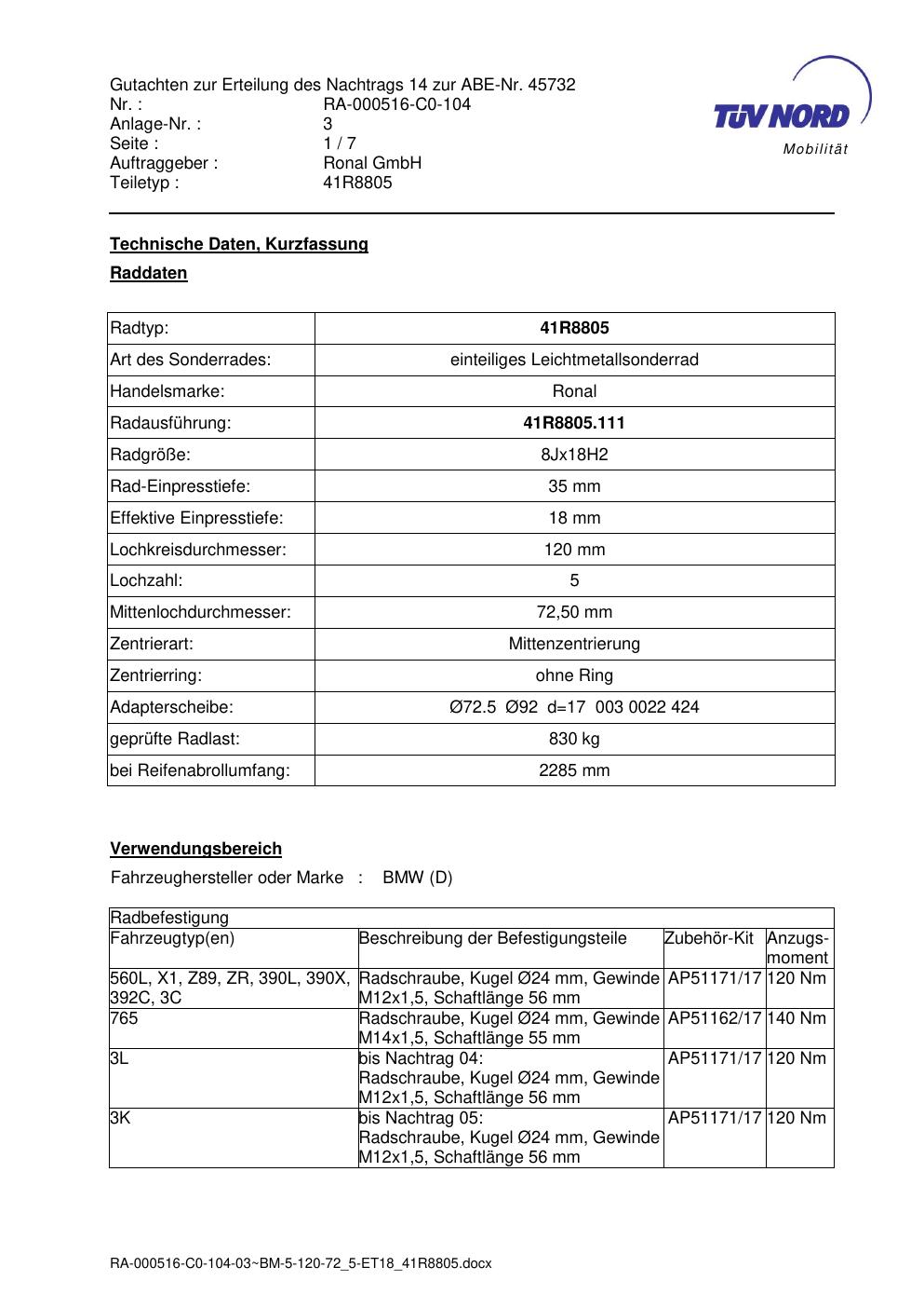 Dieses Gutachten (abe) bezieht sich auf die Alufelge brand-ronal 41R8805 in der Ausführung 8Jx18 ET 0, Mittenloch 0 mm (KBA 45732). Im PDF findest du typischerweise zulässige Reifengrößen, Auflagen/Anbauhinweise und – je nach Dokument – Hinweise zur Eintragung.