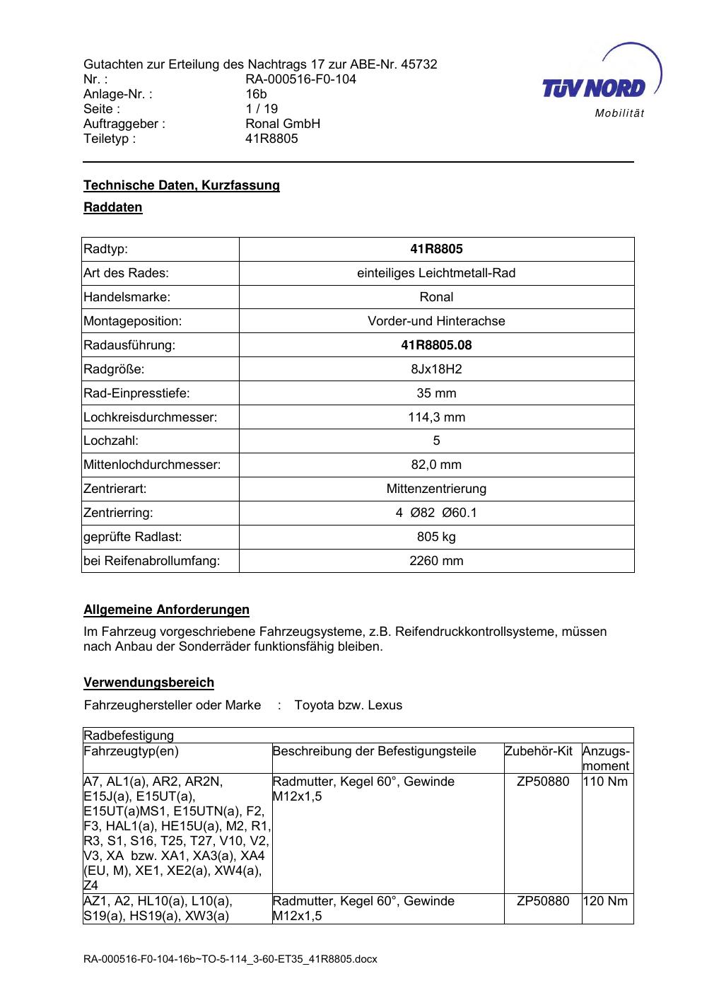 Dieses Gutachten (abe) bezieht sich auf die Alufelge brand-ronal 41R8805 in der Ausführung 8Jx18 ET 0, Mittenloch 0 mm (KBA 45732). Im PDF findest du typischerweise zulässige Reifengrößen, Auflagen/Anbauhinweise und – je nach Dokument – Hinweise zur Eintragung.