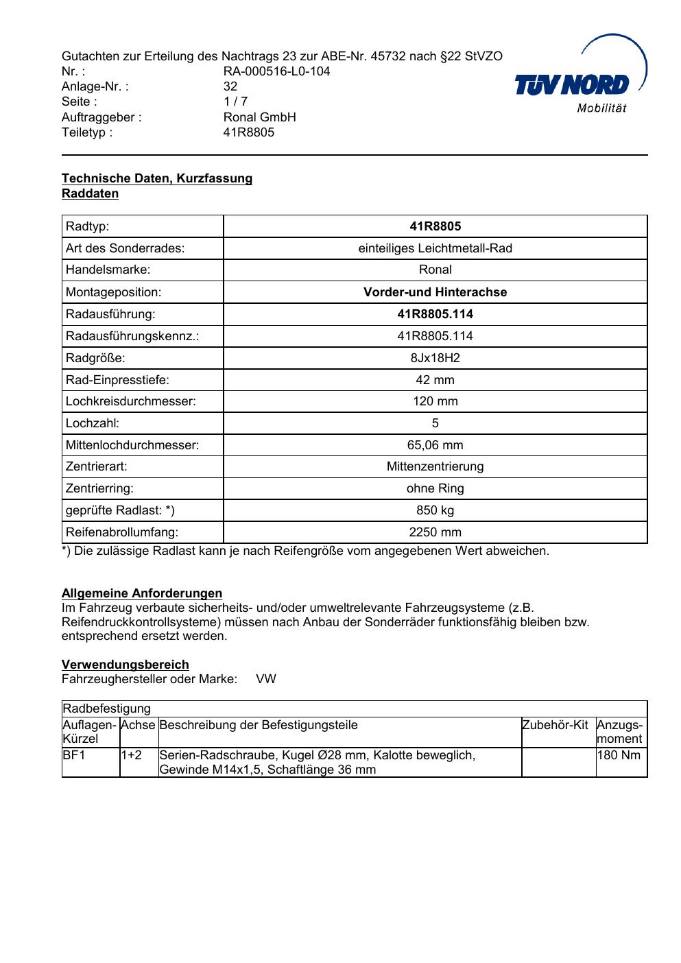 Dieses Gutachten (abe) bezieht sich auf die Alufelge brand-ronal 41R8805 in der Ausführung 8Jx18 ET 0, Mittenloch 0 mm (KBA 45732). Im PDF findest du typischerweise zulässige Reifengrößen, Auflagen/Anbauhinweise und – je nach Dokument – Hinweise zur Eintragung.
