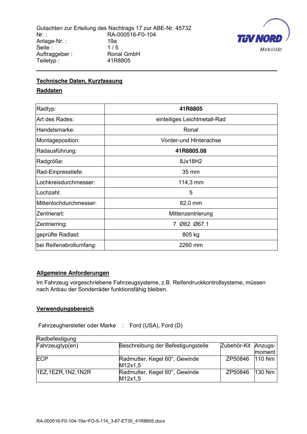 Dieses Gutachten (abe) bezieht sich auf die Alufelge brand-ronal 41R8805 in der Ausführung 8Jx18 ET 0, Mittenloch 0 mm (KBA 45732). Im PDF findest du typischerweise zulässige Reifengrößen, Auflagen/Anbauhinweise und – je nach Dokument – Hinweise zur Eintragung.
