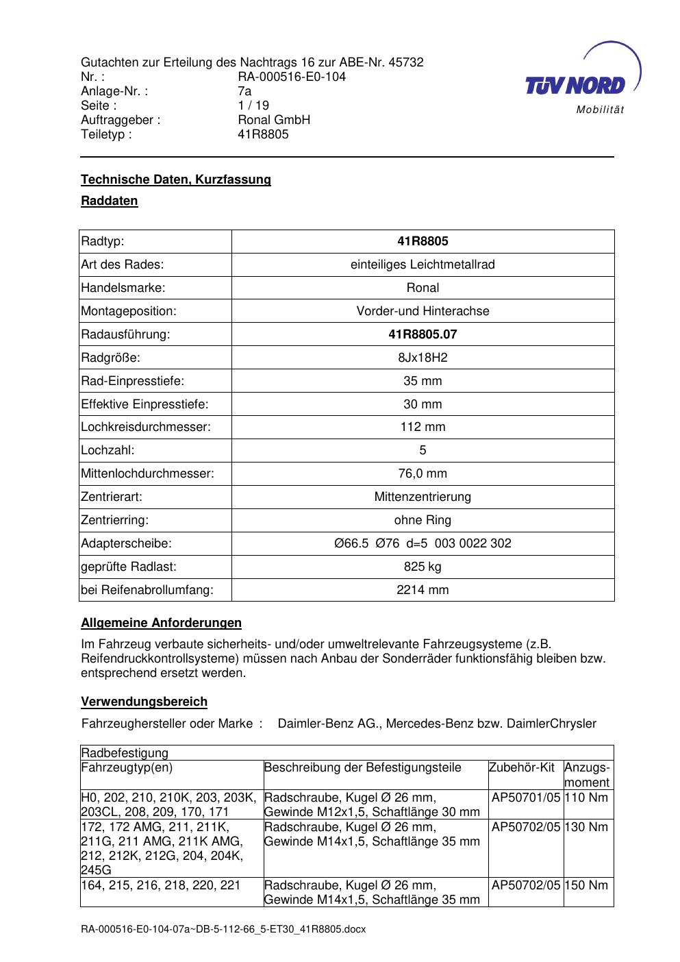 Dieses Gutachten (abe) bezieht sich auf die Alufelge brand-ronal 41R8805 in der Ausführung 8Jx18 ET 0, Mittenloch 0 mm (KBA 45732). Im PDF findest du typischerweise zulässige Reifengrößen, Auflagen/Anbauhinweise und – je nach Dokument – Hinweise zur Eintragung.