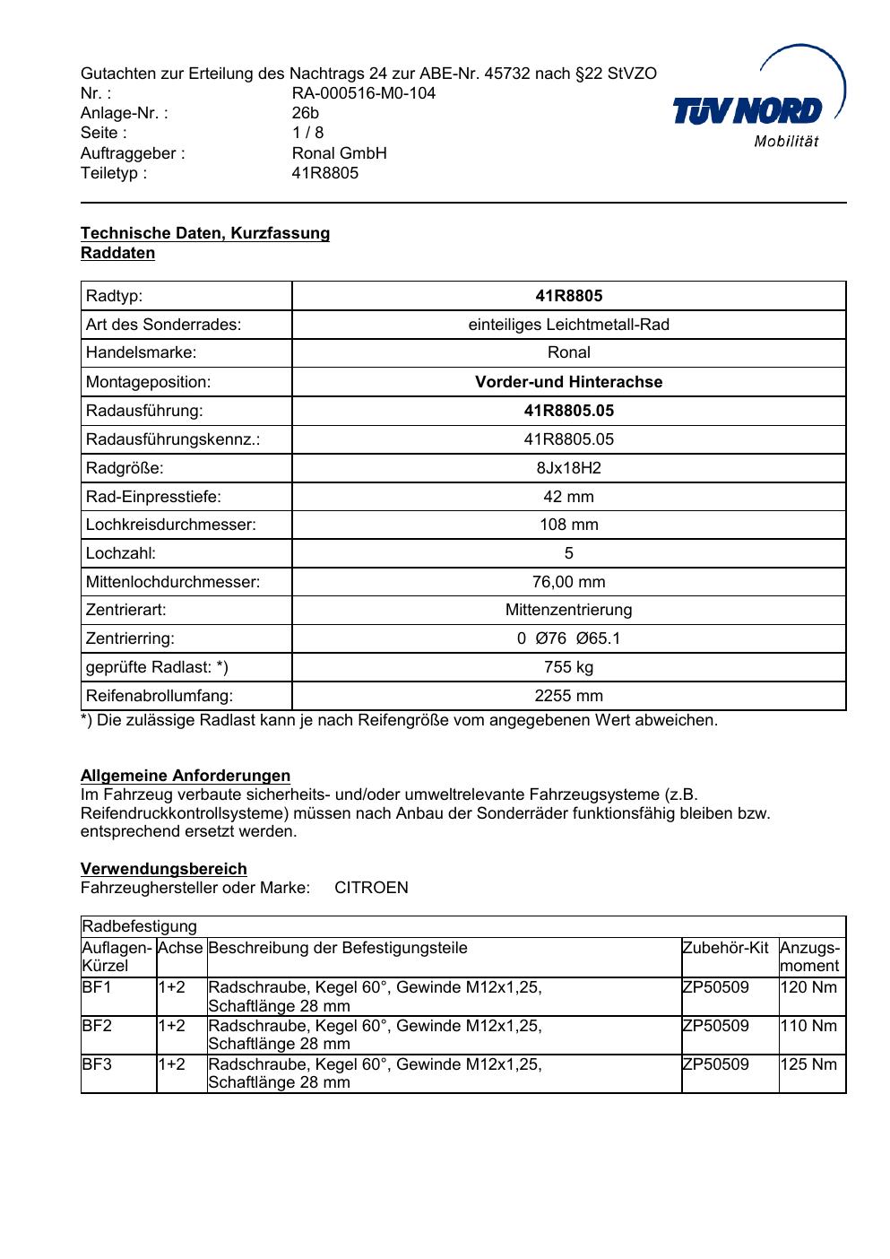 Dieses Gutachten (abe) bezieht sich auf die Alufelge brand-ronal 41R8805 in der Ausführung 8Jx18 ET 0, Mittenloch 0 mm (KBA 45732). Im PDF findest du typischerweise zulässige Reifengrößen, Auflagen/Anbauhinweise und – je nach Dokument – Hinweise zur Eintragung.