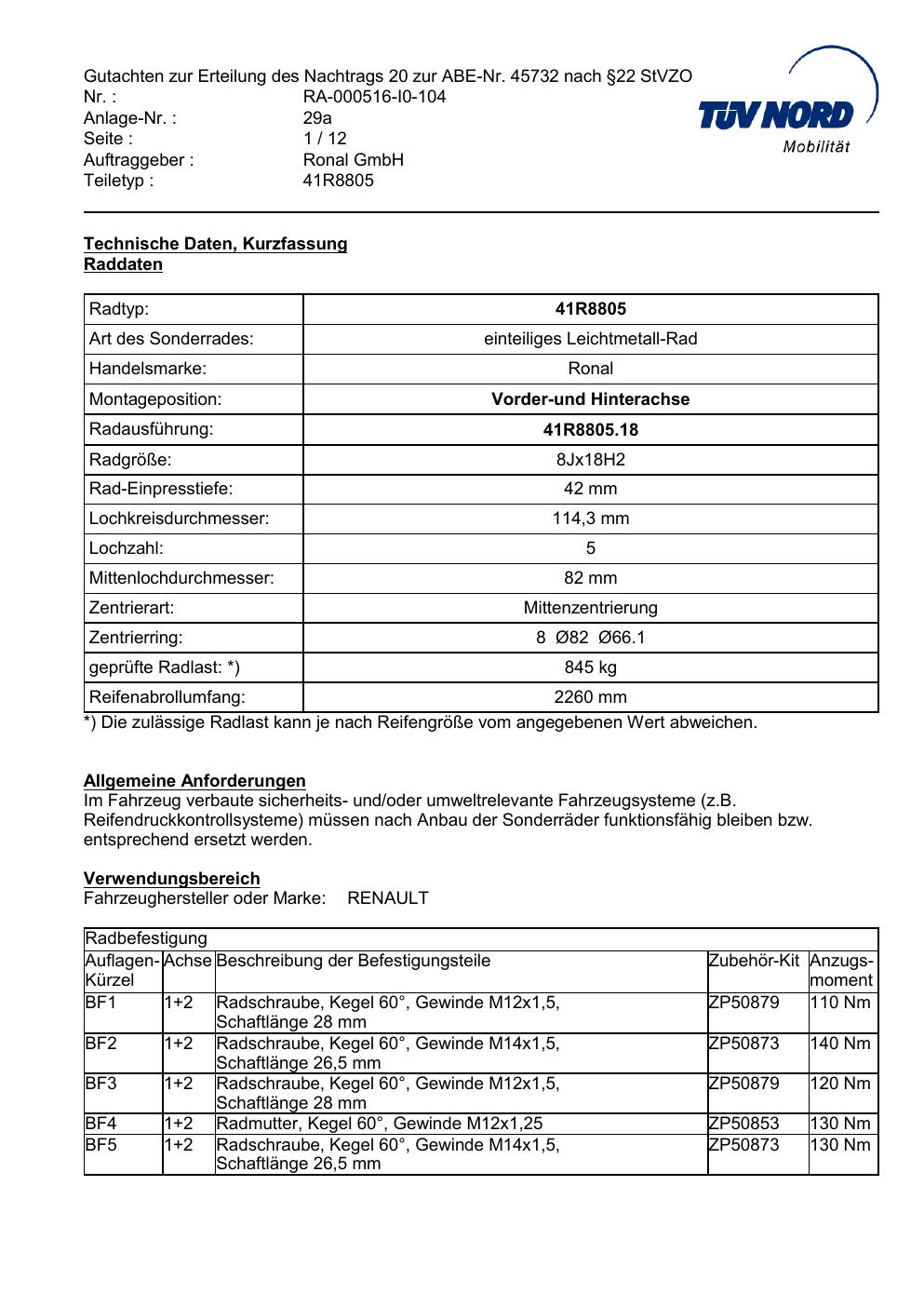 Dieses Gutachten (abe) bezieht sich auf die Alufelge brand-ronal 41R8805 in der Ausführung 8Jx18 ET 0, Mittenloch 0 mm (KBA 45732). Im PDF findest du typischerweise zulässige Reifengrößen, Auflagen/Anbauhinweise und – je nach Dokument – Hinweise zur Eintragung.