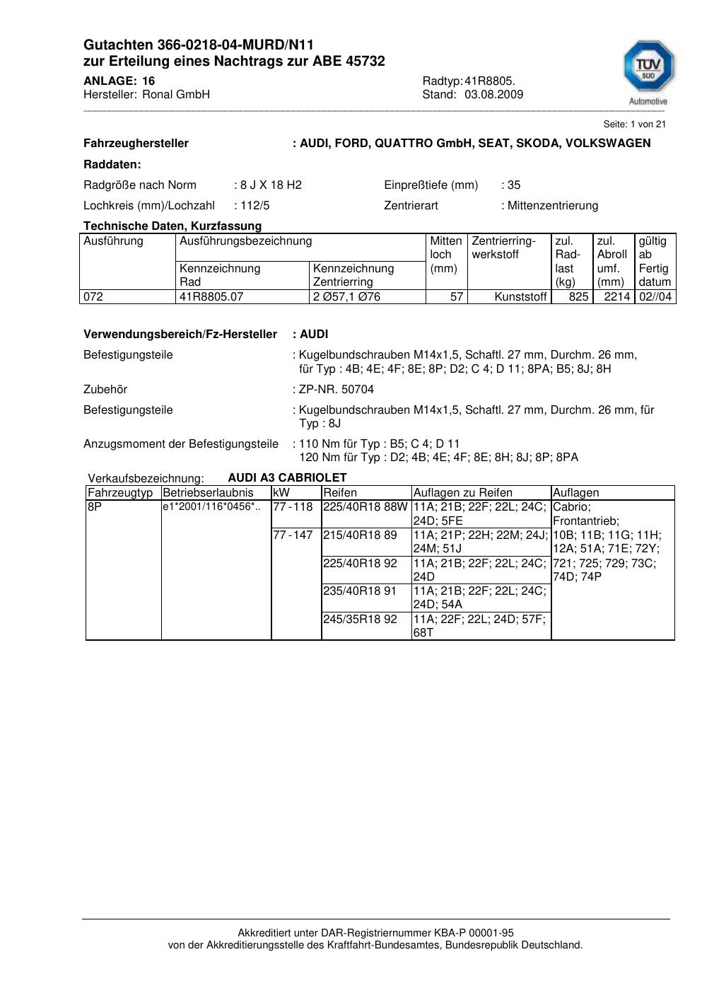 Dieses Gutachten (abe) bezieht sich auf die Alufelge Ronal 41R8805 in der Ausführung 8Jx18 ET 0, Mittenloch 0 mm (KBA 45732). Im PDF findest du typischerweise zulässige Reifengrößen, Auflagen/Anbauhinweise und – je nach Dokument – Hinweise zur Eintragung.