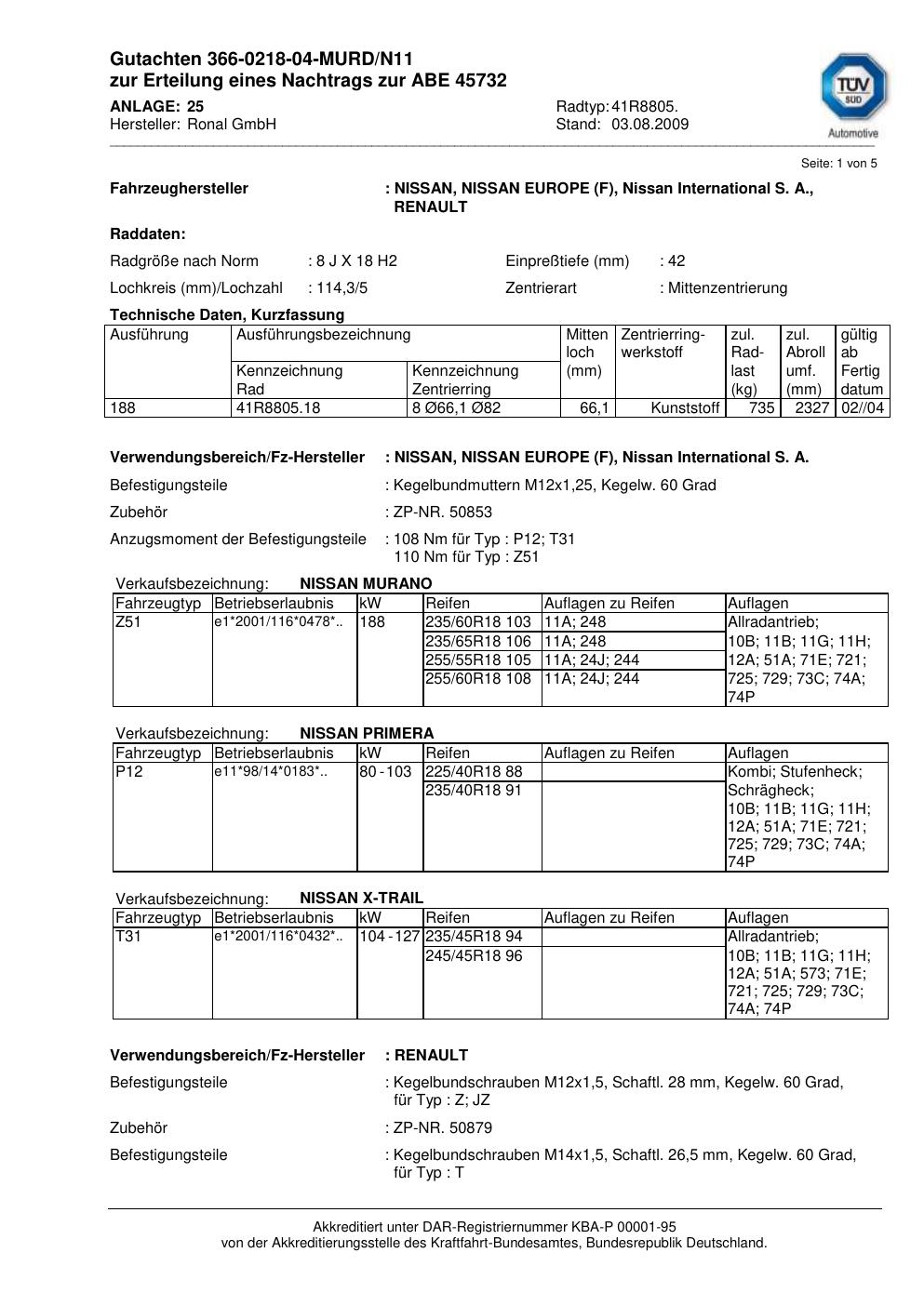 Dieses Gutachten (abe) bezieht sich auf die Alufelge Ronal 41R8805 in der Ausführung 8Jx18 ET 0, Mittenloch 0 mm (KBA 45732). Im PDF findest du typischerweise zulässige Reifengrößen, Auflagen/Anbauhinweise und – je nach Dokument – Hinweise zur Eintragung.