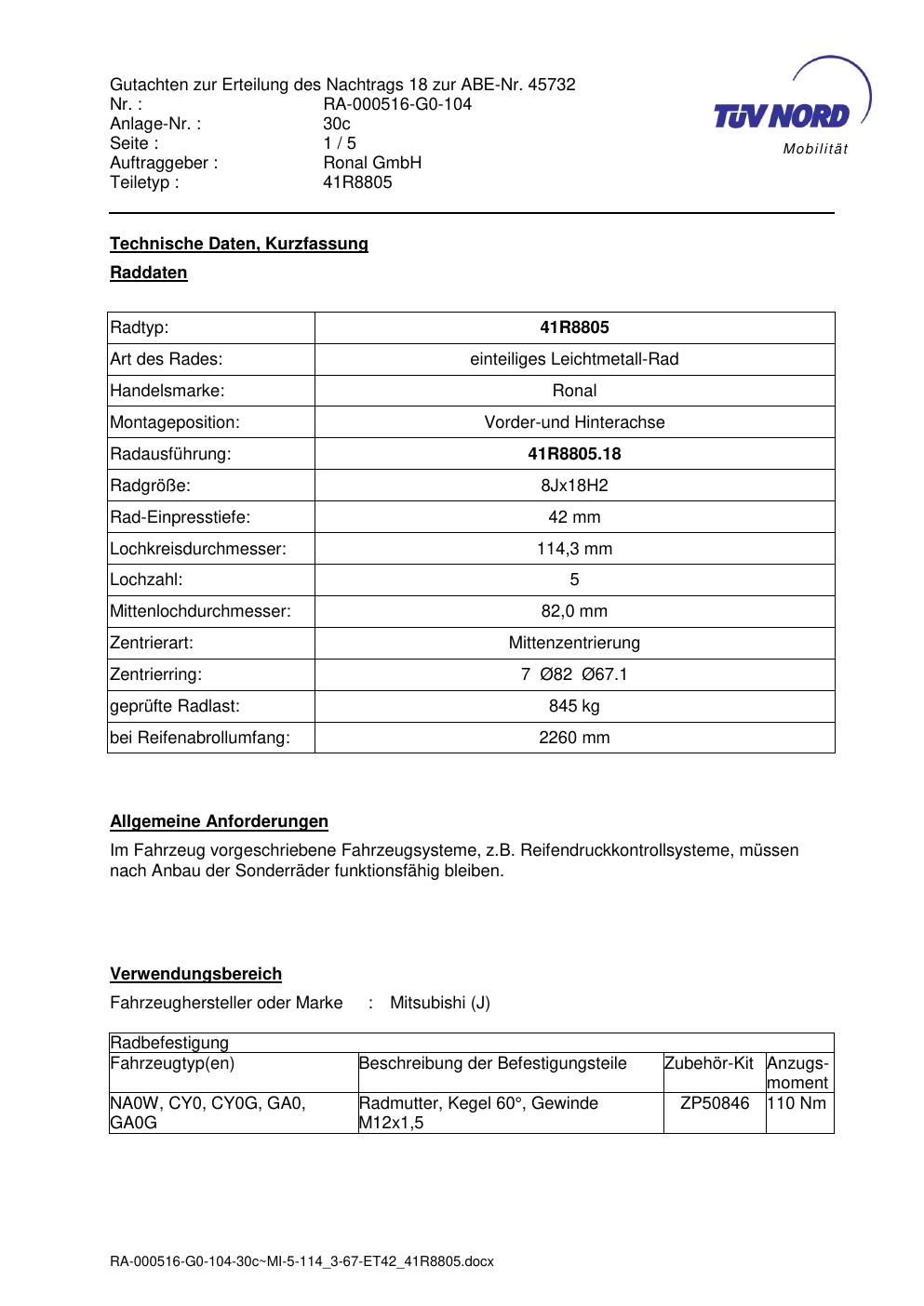 Dieses Gutachten (abe) bezieht sich auf die Alufelge brand-ronal 41R8805 in der Ausführung 8Jx18 ET 0, Mittenloch 0 mm (KBA 45732). Im PDF findest du typischerweise zulässige Reifengrößen, Auflagen/Anbauhinweise und – je nach Dokument – Hinweise zur Eintragung.