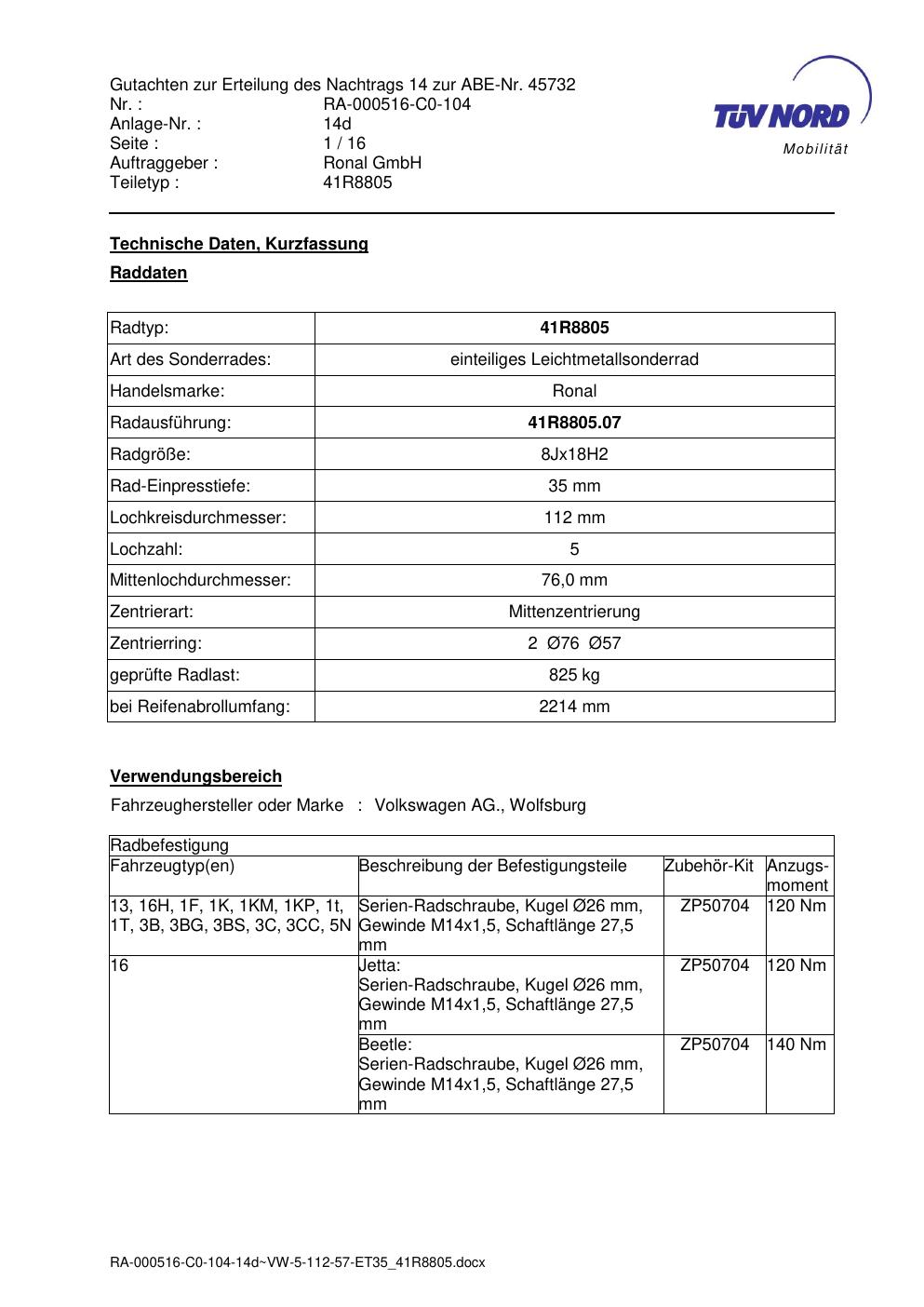 Dieses Gutachten (abe) bezieht sich auf die Alufelge brand-ronal 41R8805 in der Ausführung 8Jx18 ET 0, Mittenloch 0 mm (KBA 45732). Im PDF findest du typischerweise zulässige Reifengrößen, Auflagen/Anbauhinweise und – je nach Dokument – Hinweise zur Eintragung.