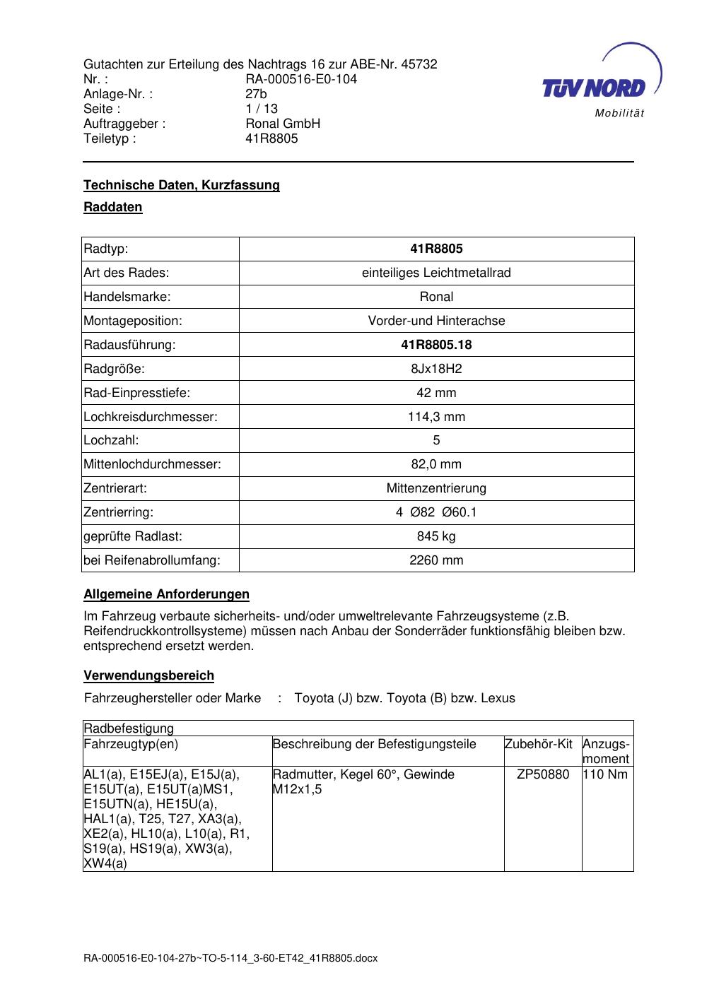 Dieses Gutachten (abe) bezieht sich auf die Alufelge brand-ronal 41R8805 in der Ausführung 8Jx18 ET 0, Mittenloch 0 mm (KBA 45732). Im PDF findest du typischerweise zulässige Reifengrößen, Auflagen/Anbauhinweise und – je nach Dokument – Hinweise zur Eintragung.