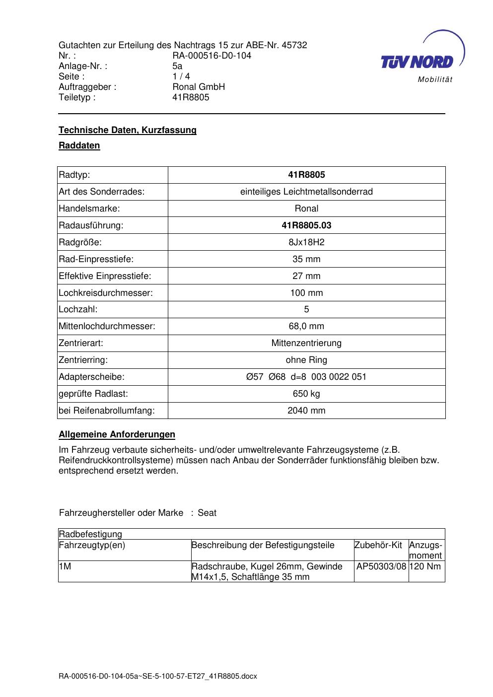 Dieses Gutachten (abe) bezieht sich auf die Alufelge brand-ronal 41R8805 in der Ausführung 8Jx18 ET 0, Mittenloch 0 mm (KBA 45732). Im PDF findest du typischerweise zulässige Reifengrößen, Auflagen/Anbauhinweise und – je nach Dokument – Hinweise zur Eintragung.