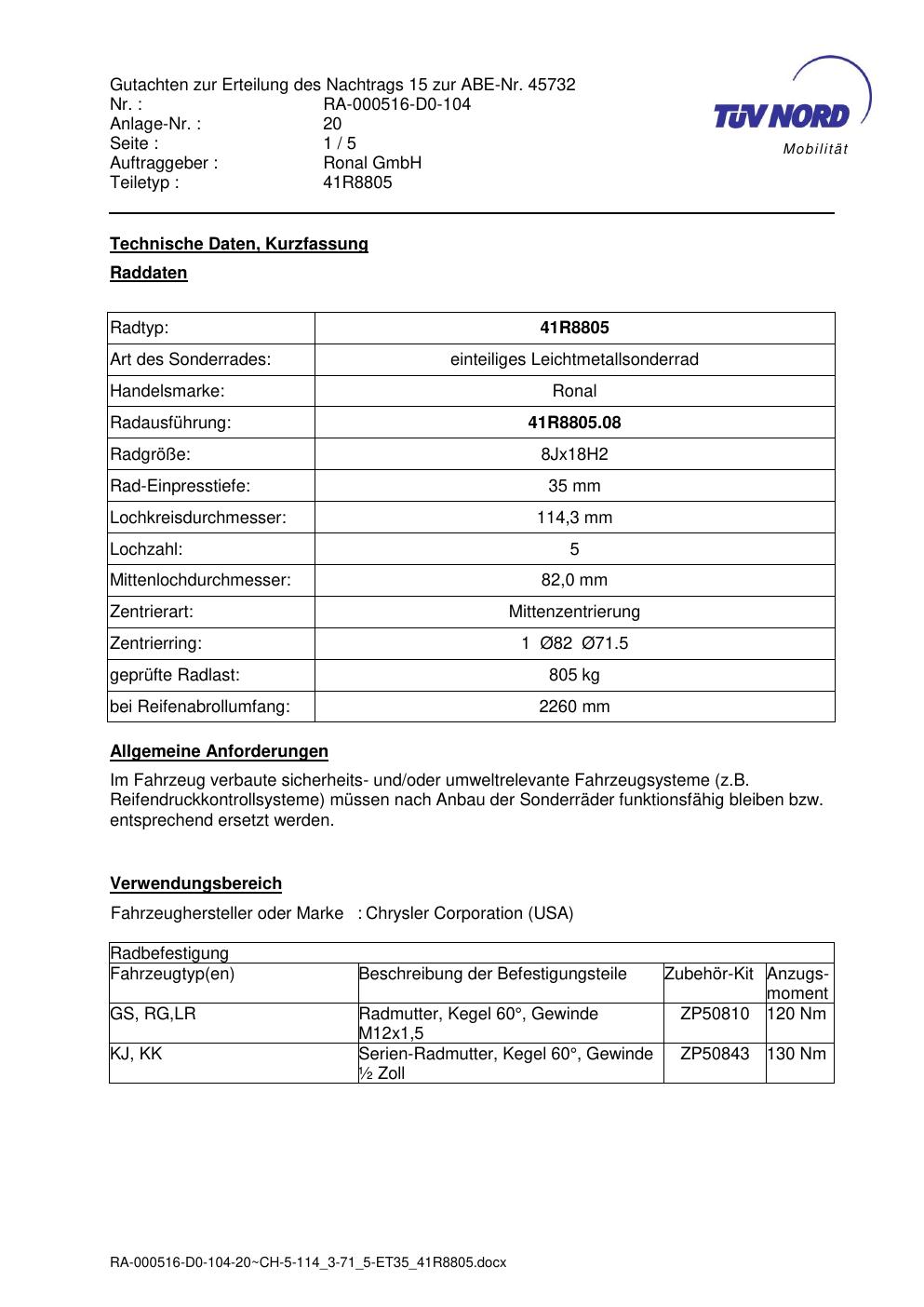 Dieses Gutachten (abe) bezieht sich auf die Alufelge brand-ronal 41R8805 in der Ausführung 8Jx18 ET 0, Mittenloch 0 mm (KBA 45732). Im PDF findest du typischerweise zulässige Reifengrößen, Auflagen/Anbauhinweise und – je nach Dokument – Hinweise zur Eintragung.