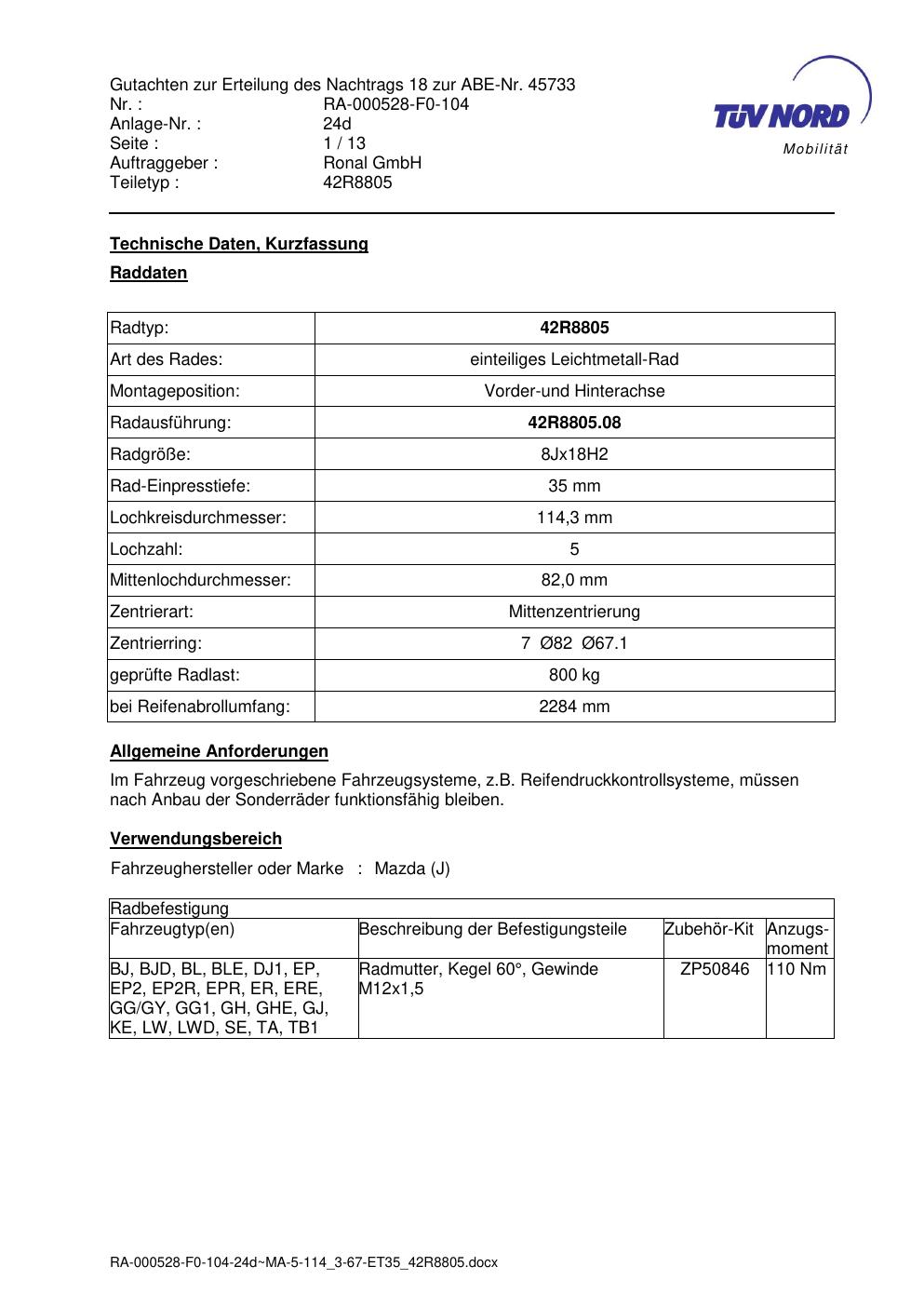 Dieses Gutachten (abe) bezieht sich auf die Alufelge brand-rial 42R8805 in der Ausführung 8Jx18 ET 0, Mittenloch 0 mm (KBA 45733). Im PDF findest du typischerweise zulässige Reifengrößen, Auflagen/Anbauhinweise und – je nach Dokument – Hinweise zur Eintragung.