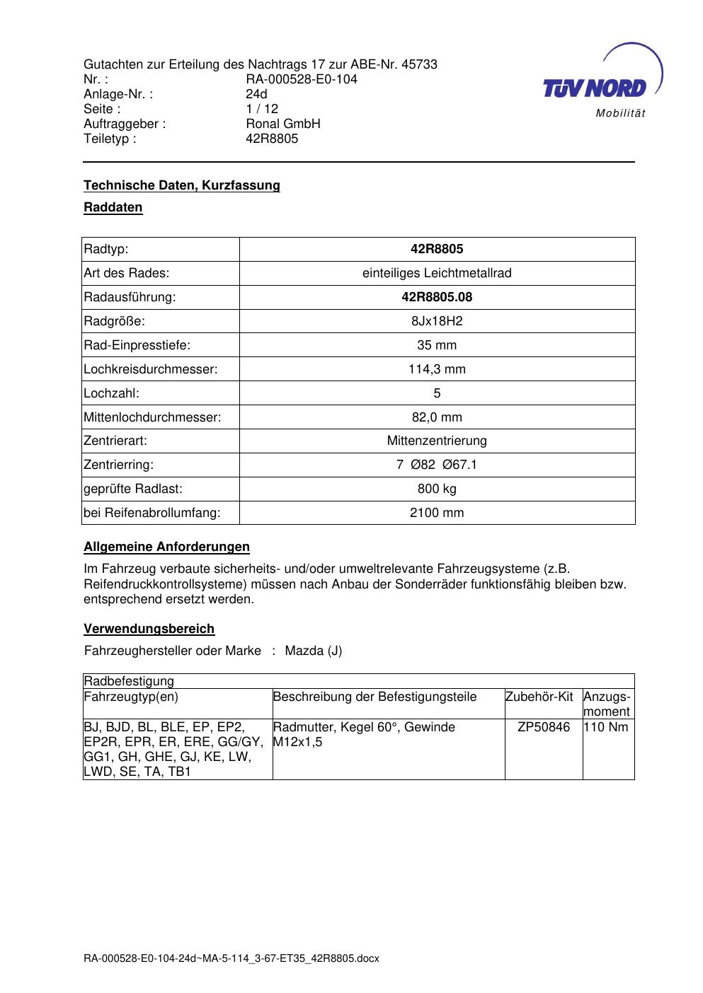 Dieses Gutachten (abe) bezieht sich auf die Alufelge brand-rial 42R8805 in der Ausführung 8Jx18 ET 0, Mittenloch 0 mm (KBA 45733). Im PDF findest du typischerweise zulässige Reifengrößen, Auflagen/Anbauhinweise und – je nach Dokument – Hinweise zur Eintragung.