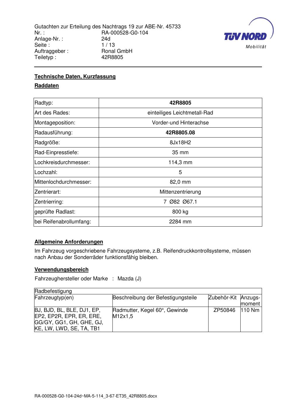 Dieses Gutachten (abe) bezieht sich auf die Alufelge brand-rial 42R8805 in der Ausführung 8Jx18 ET 0, Mittenloch 0 mm (KBA 45733). Im PDF findest du typischerweise zulässige Reifengrößen, Auflagen/Anbauhinweise und – je nach Dokument – Hinweise zur Eintragung.