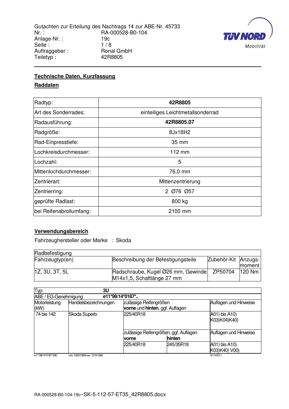 Dieses Gutachten (abe) bezieht sich auf die Alufelge brand-ronal 42R8805 in der Ausführung 8Jx18 ET 0, Mittenloch 0 mm (KBA 45733). Im PDF findest du typischerweise zulässige Reifengrößen, Auflagen/Anbauhinweise und – je nach Dokument – Hinweise zur Eintragung.