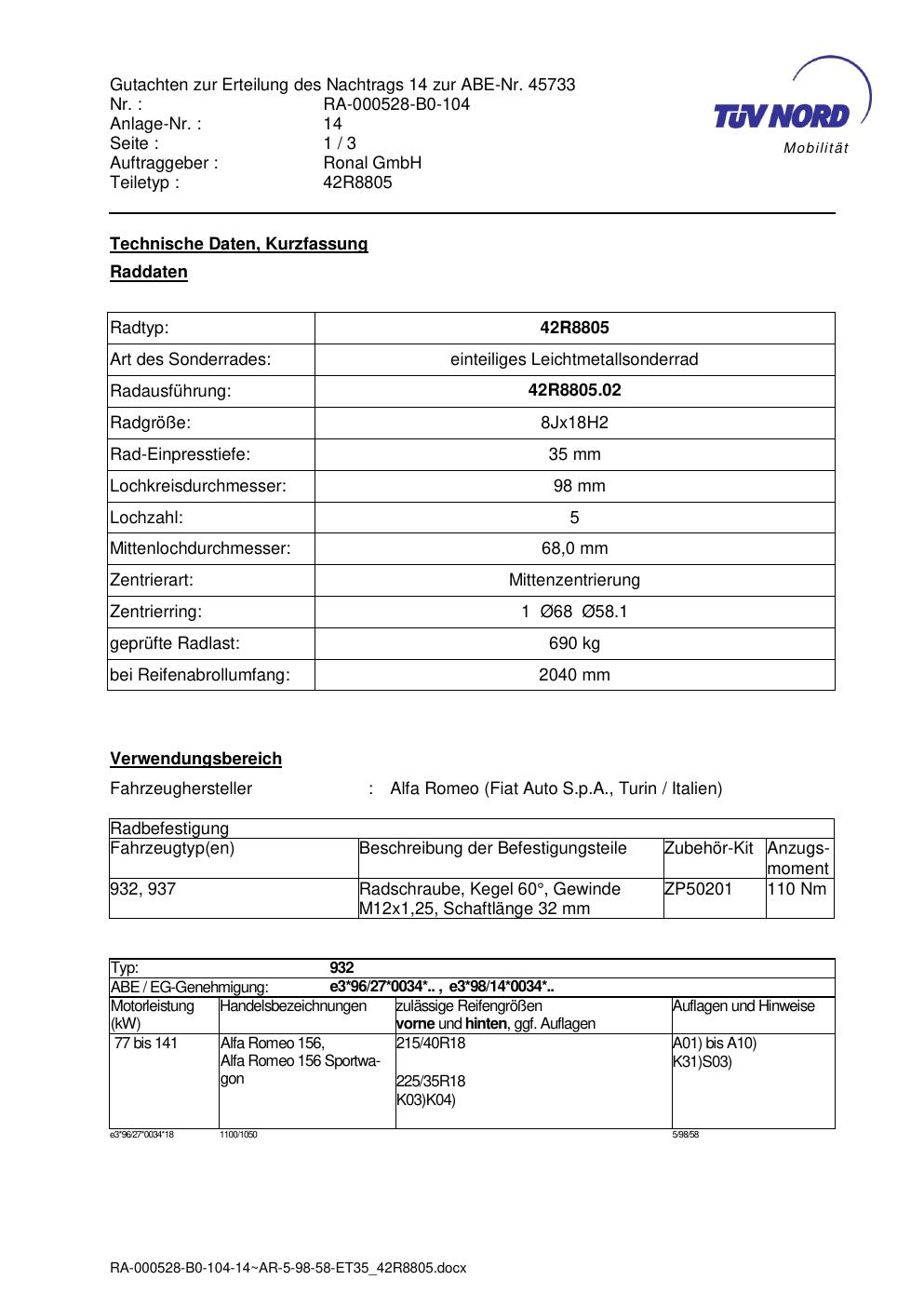 Dieses Gutachten (abe) bezieht sich auf die Alufelge brand-ronal 42R8805 in der Ausführung 8Jx18 ET 0, Mittenloch 0 mm (KBA 45733). Im PDF findest du typischerweise zulässige Reifengrößen, Auflagen/Anbauhinweise und – je nach Dokument – Hinweise zur Eintragung.