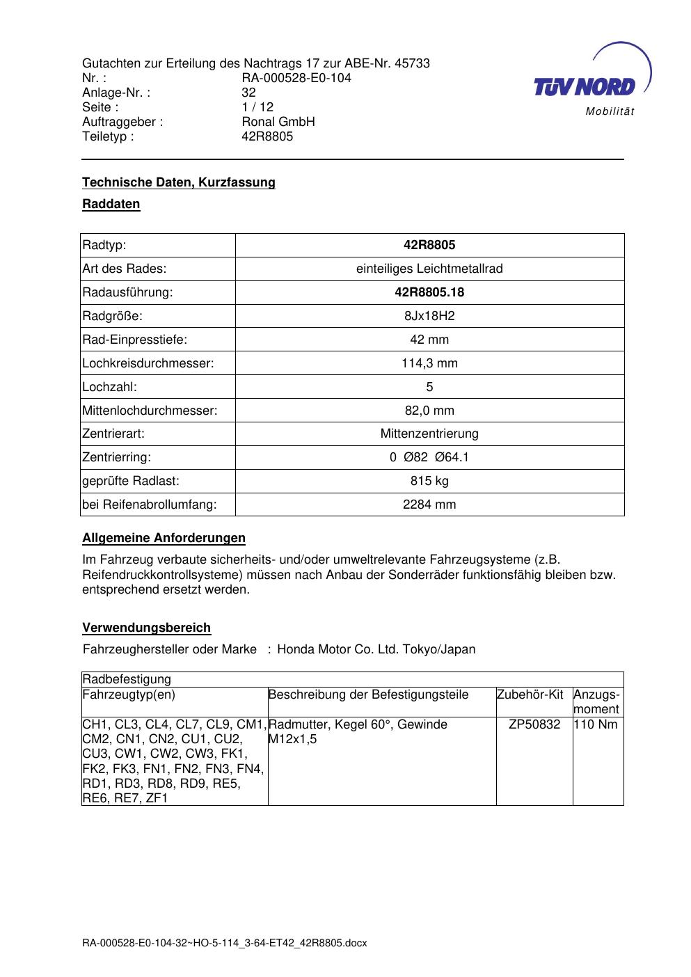 Dieses Gutachten (abe) bezieht sich auf die Alufelge brand-ronal 42R8805 in der Ausführung 8Jx18 ET 0, Mittenloch 0 mm (KBA 45733). Im PDF findest du typischerweise zulässige Reifengrößen, Auflagen/Anbauhinweise und – je nach Dokument – Hinweise zur Eintragung.
