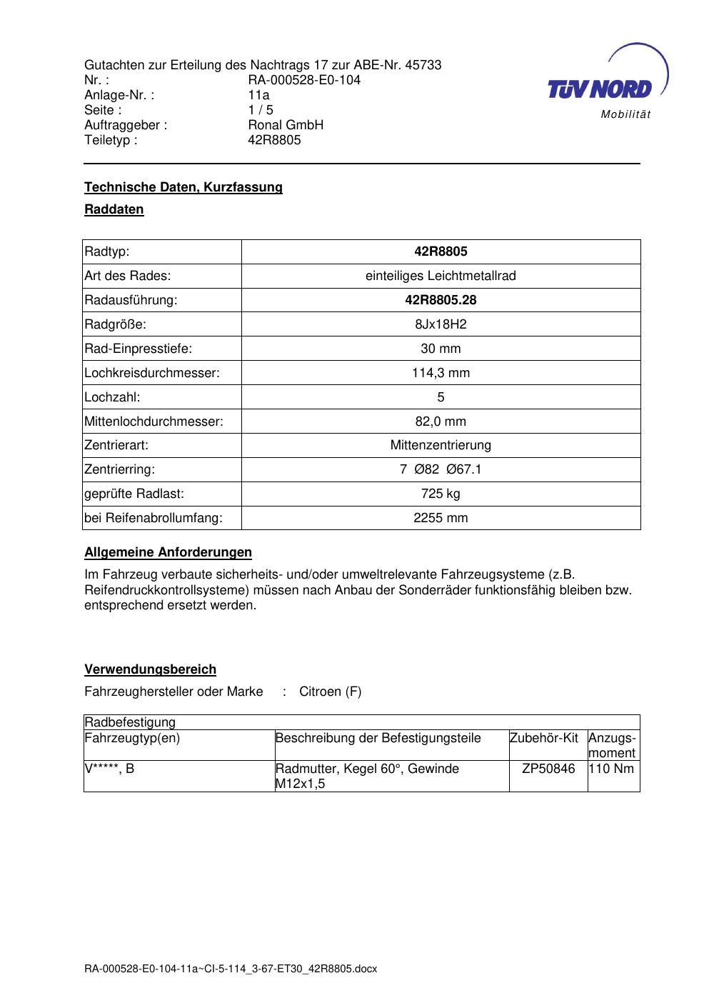 Dieses Gutachten (abe) bezieht sich auf die Alufelge brand-ronal 42R8805 in der Ausführung 8Jx18 ET 0, Mittenloch 0 mm (KBA 45733). Im PDF findest du typischerweise zulässige Reifengrößen, Auflagen/Anbauhinweise und – je nach Dokument – Hinweise zur Eintragung.