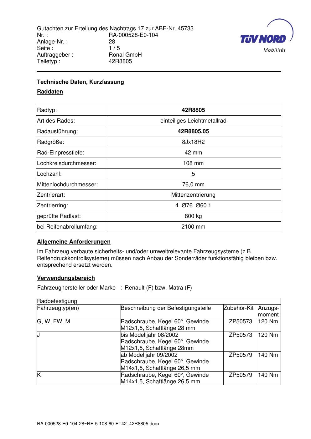 Dieses Gutachten (abe) bezieht sich auf die Alufelge brand-ronal 42R8805 in der Ausführung 8Jx18 ET 0, Mittenloch 0 mm (KBA 45733). Im PDF findest du typischerweise zulässige Reifengrößen, Auflagen/Anbauhinweise und – je nach Dokument – Hinweise zur Eintragung.