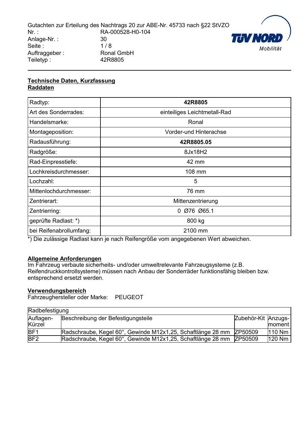 Dieses Gutachten (abe) bezieht sich auf die Alufelge brand-ronal 42R8805 in der Ausführung 8Jx18 ET 0, Mittenloch 0 mm (KBA 45733). Im PDF findest du typischerweise zulässige Reifengrößen, Auflagen/Anbauhinweise und – je nach Dokument – Hinweise zur Eintragung.