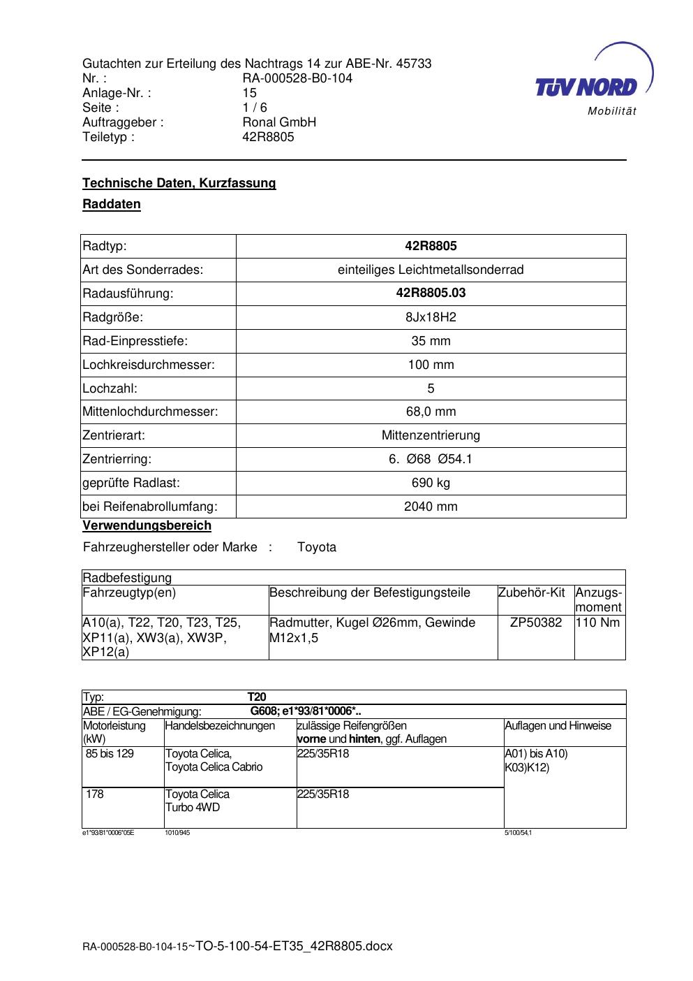 Dieses Gutachten (abe) bezieht sich auf die Alufelge brand-ronal 42R8805 in der Ausführung 8Jx18 ET 0, Mittenloch 0 mm (KBA 45733). Im PDF findest du typischerweise zulässige Reifengrößen, Auflagen/Anbauhinweise und – je nach Dokument – Hinweise zur Eintragung.
