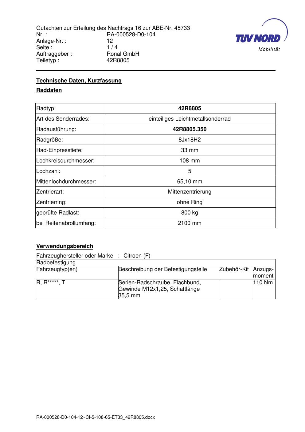 Dieses Gutachten (abe) bezieht sich auf die Alufelge brand-ronal 42R8805 in der Ausführung 8Jx18 ET 0, Mittenloch 0 mm (KBA 45733). Im PDF findest du typischerweise zulässige Reifengrößen, Auflagen/Anbauhinweise und – je nach Dokument – Hinweise zur Eintragung.