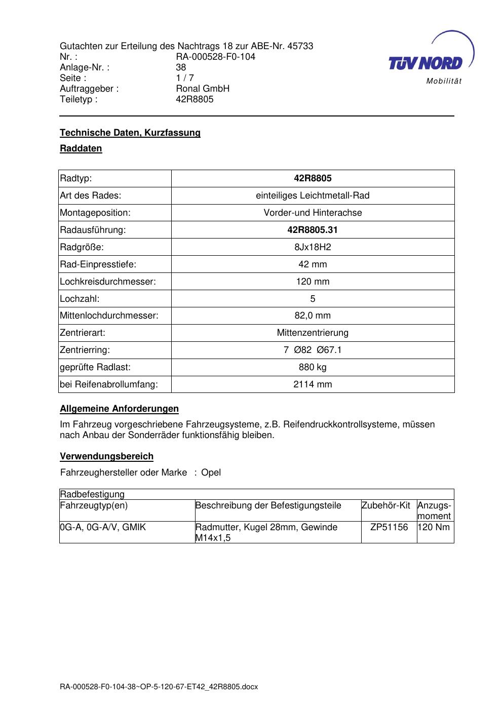 Dieses Gutachten (abe) bezieht sich auf die Alufelge brand-ronal 42R8805 in der Ausführung 8Jx18 ET 0, Mittenloch 0 mm (KBA 45733). Im PDF findest du typischerweise zulässige Reifengrößen, Auflagen/Anbauhinweise und – je nach Dokument – Hinweise zur Eintragung.
