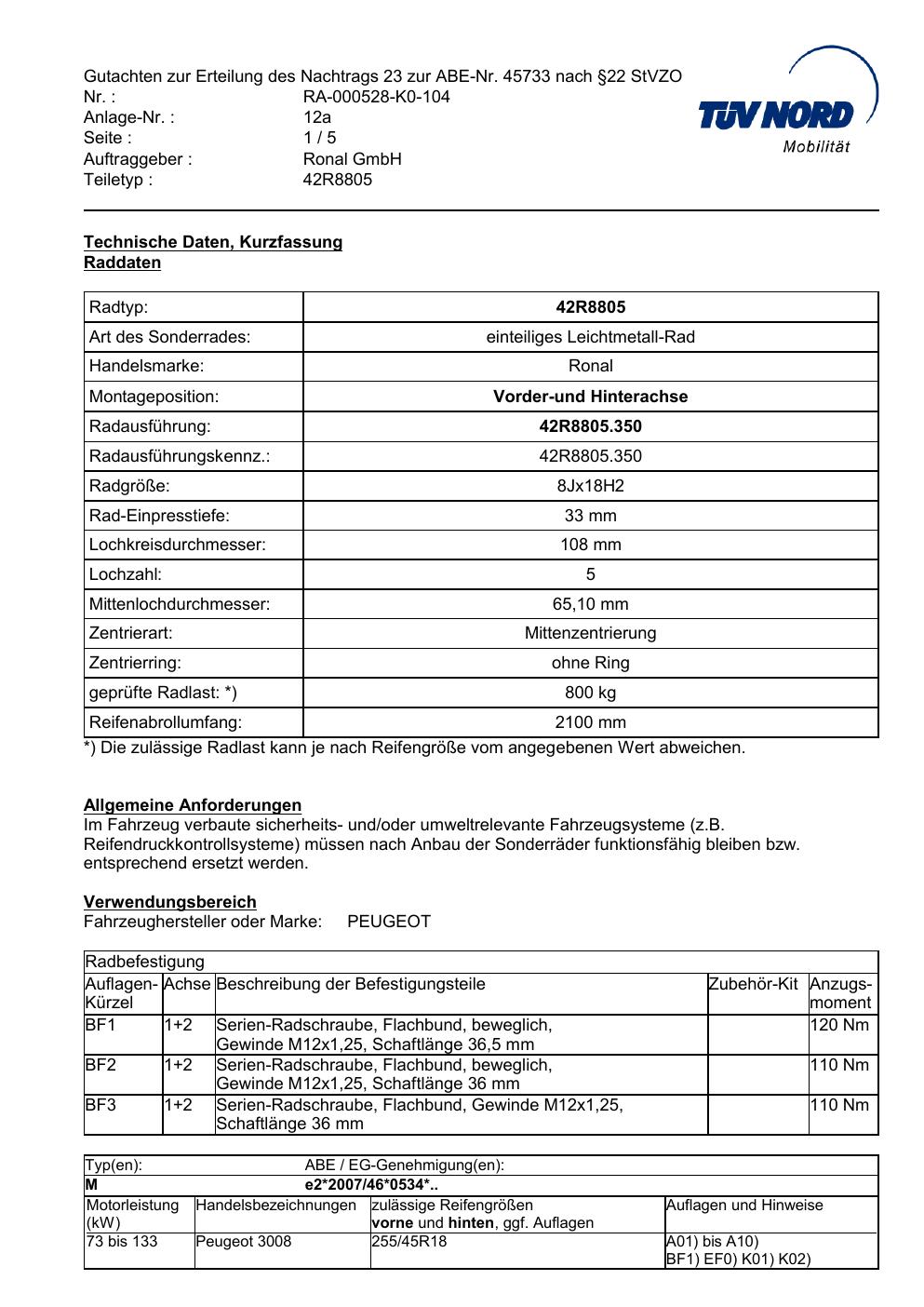 Dieses Gutachten (abe) bezieht sich auf die Alufelge brand-ronal 42R8805 in der Ausführung 8Jx18 ET 0, Mittenloch 0 mm (KBA 45733). Im PDF findest du typischerweise zulässige Reifengrößen, Auflagen/Anbauhinweise und – je nach Dokument – Hinweise zur Eintragung.