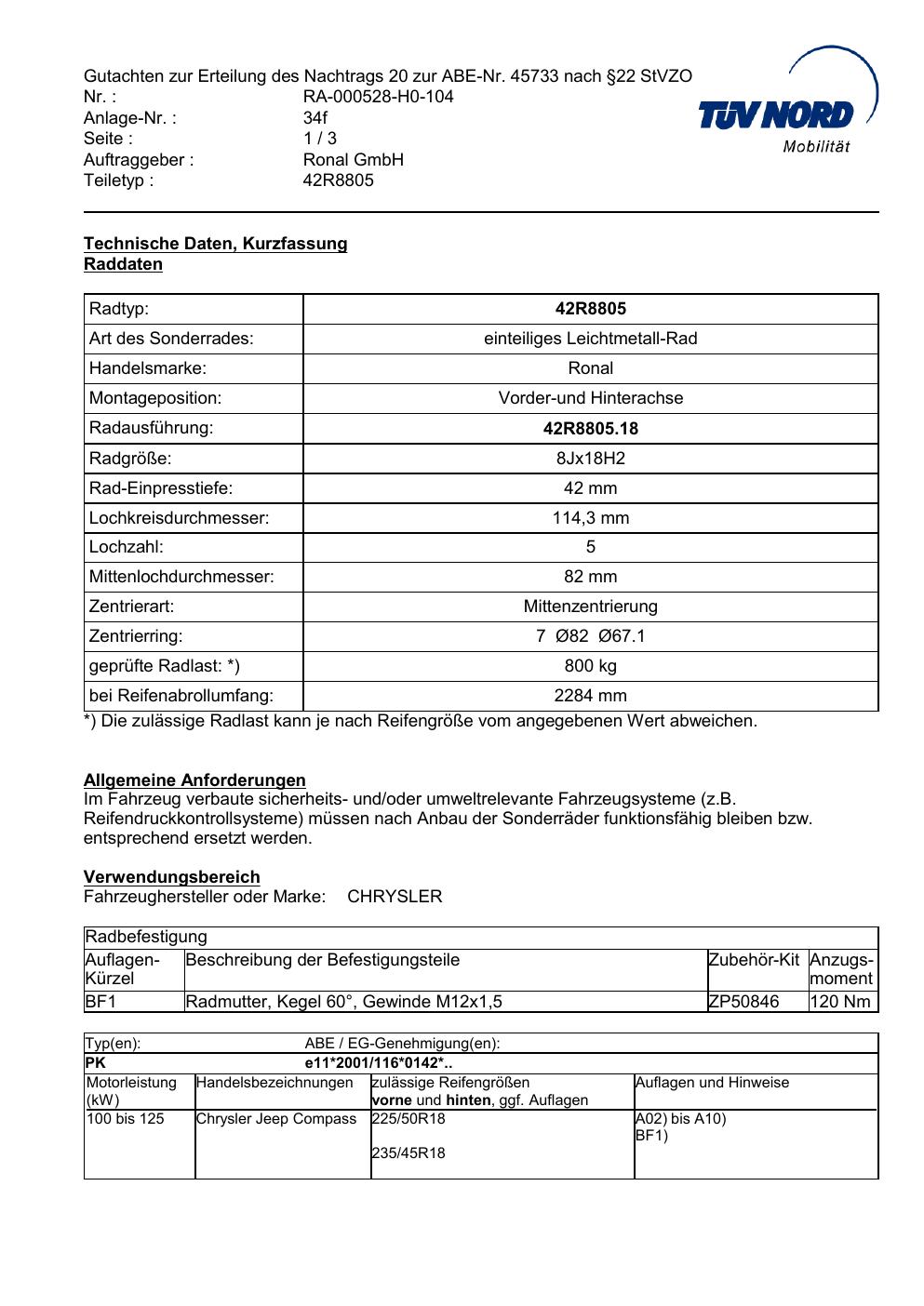 Dieses Gutachten (abe) bezieht sich auf die Alufelge brand-ronal 42R8805 in der Ausführung 8Jx18 ET 0, Mittenloch 0 mm (KBA 45733). Im PDF findest du typischerweise zulässige Reifengrößen, Auflagen/Anbauhinweise und – je nach Dokument – Hinweise zur Eintragung.