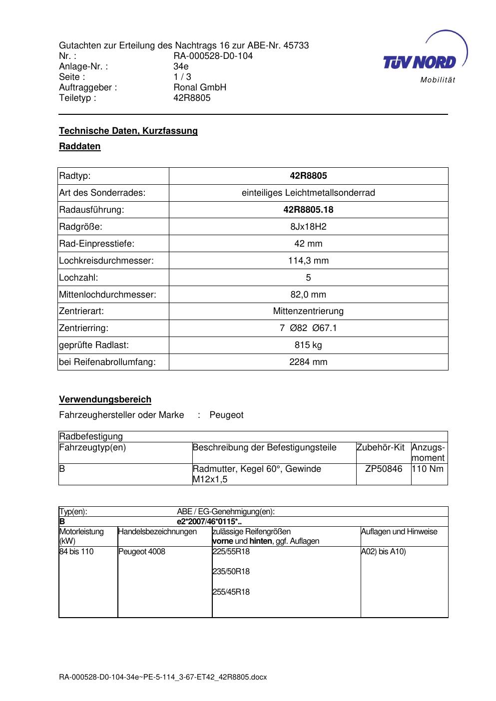 Dieses Gutachten (abe) bezieht sich auf die Alufelge brand-ronal 42R8805 in der Ausführung 8Jx18 ET 0, Mittenloch 0 mm (KBA 45733). Im PDF findest du typischerweise zulässige Reifengrößen, Auflagen/Anbauhinweise und – je nach Dokument – Hinweise zur Eintragung.