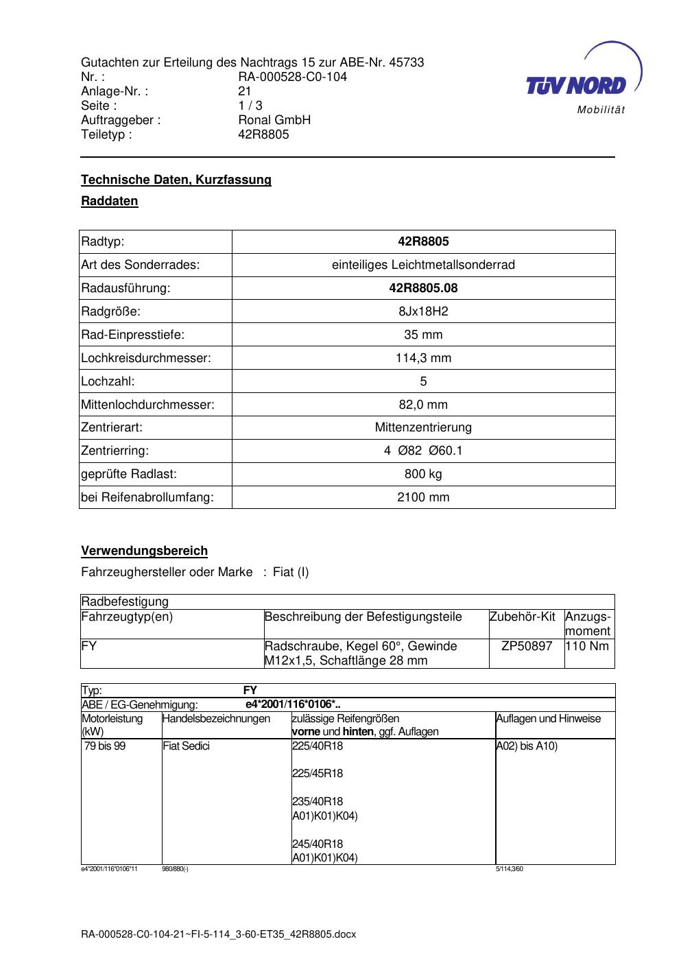 Dieses Gutachten (abe) bezieht sich auf die Alufelge brand-ronal 42R8805 in der Ausführung 8Jx18 ET 0, Mittenloch 0 mm (KBA 45733). Im PDF findest du typischerweise zulässige Reifengrößen, Auflagen/Anbauhinweise und – je nach Dokument – Hinweise zur Eintragung.