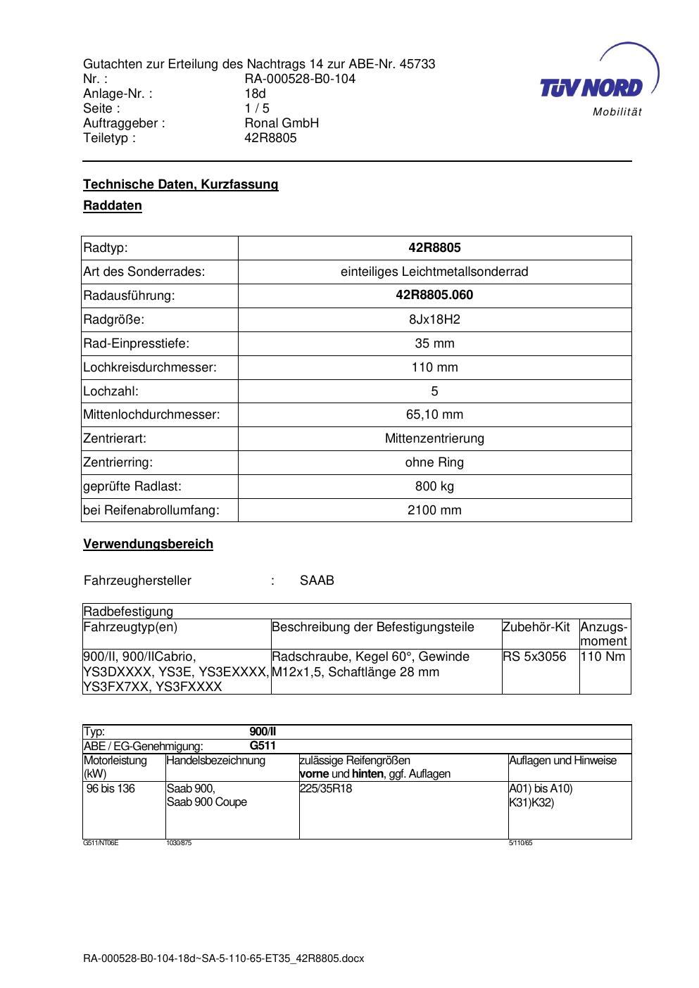 Dieses Gutachten (abe) bezieht sich auf die Alufelge brand-ronal 42R8805 in der Ausführung 8Jx18 ET 0, Mittenloch 0 mm (KBA 45733). Im PDF findest du typischerweise zulässige Reifengrößen, Auflagen/Anbauhinweise und – je nach Dokument – Hinweise zur Eintragung.