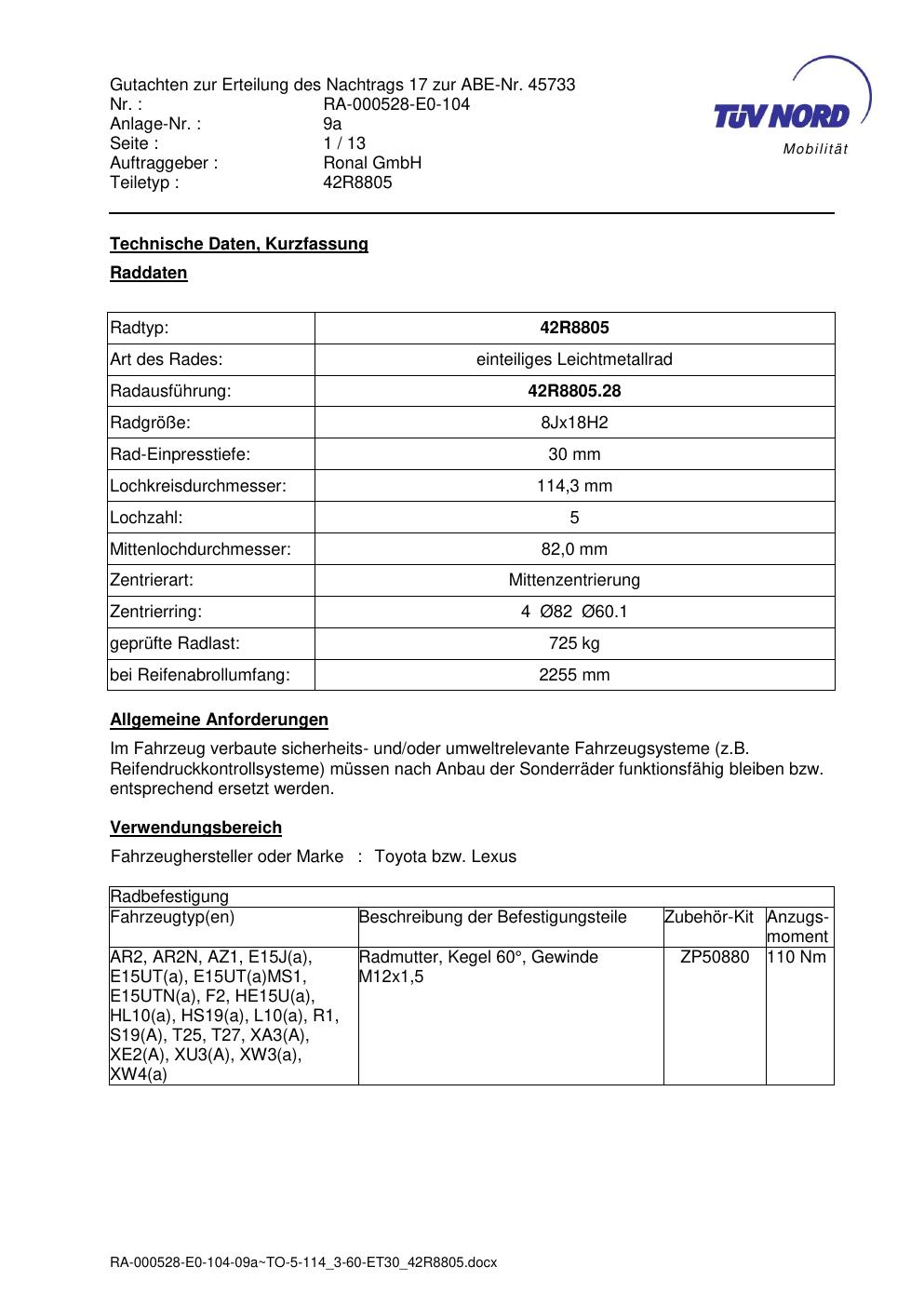 Dieses Gutachten (abe) bezieht sich auf die Alufelge brand-ronal 42R8805 in der Ausführung 8Jx18 ET 0, Mittenloch 0 mm (KBA 45733). Im PDF findest du typischerweise zulässige Reifengrößen, Auflagen/Anbauhinweise und – je nach Dokument – Hinweise zur Eintragung.